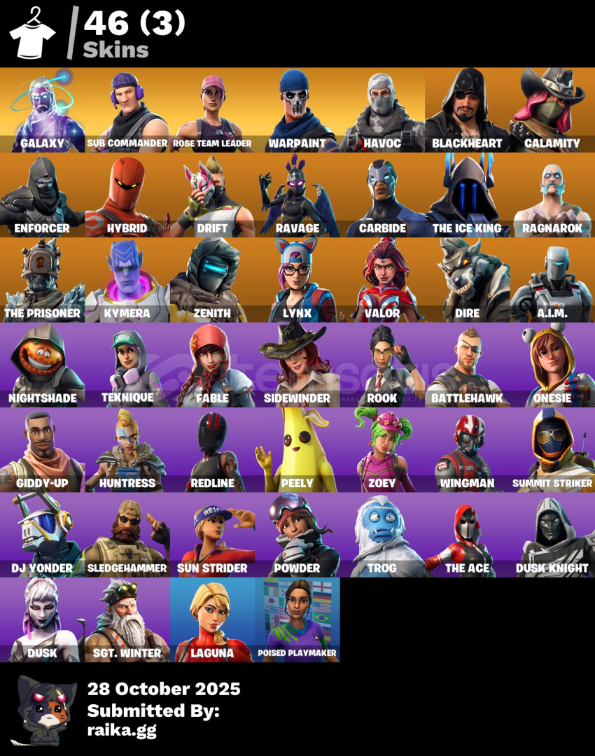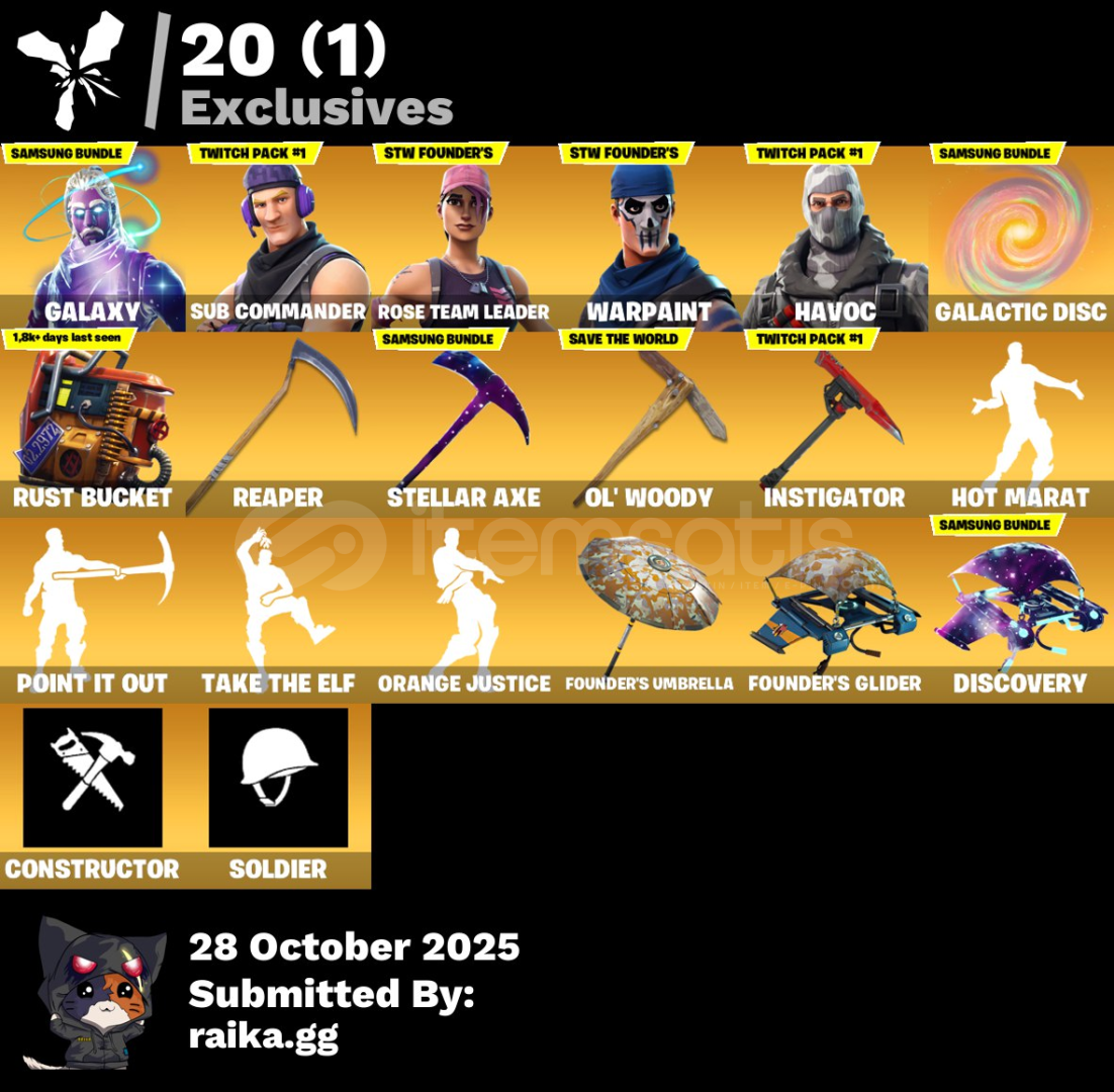 [PC] 46 skins | OG STW | Galaxy | Yardımcı Yarbay | Havoc | Karasakal | Belalı Kovboy | Kara Muhafız | Melez | DRIFT | Gece Kuşu | Demir Maske | 350 VB