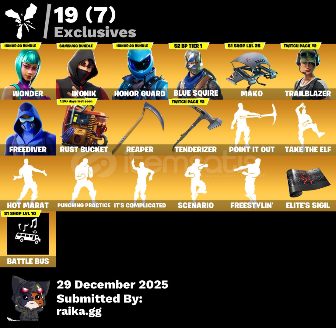 hesapta çok nadir olan wonder ikonik ve honor guard skinleri vardırek olarak twitch prime 2 bundle vardır ve çok nadir mako glider vardırhesap maillidir direkt mail değişimi yapılacaktırfreediver skinini ben aldımits complicated emote kodunu ben kullandımdark and fire bundle ben aldımhesaba her platform bağlanır xbox hesabını ben bağladım xbox hesabınıda vereceğimdaha fazla bilgi iç...