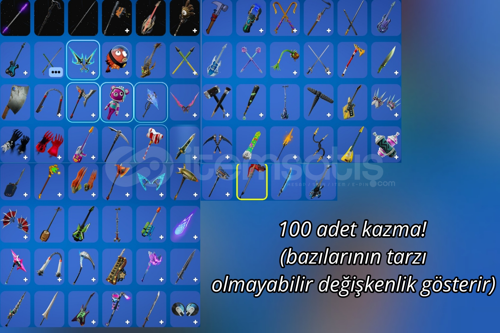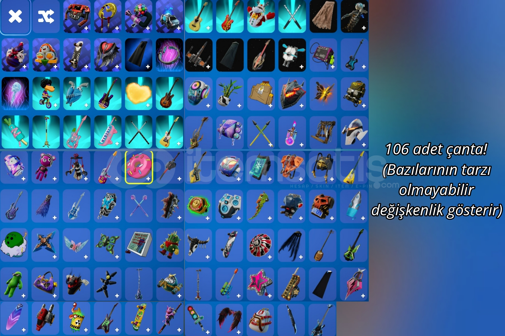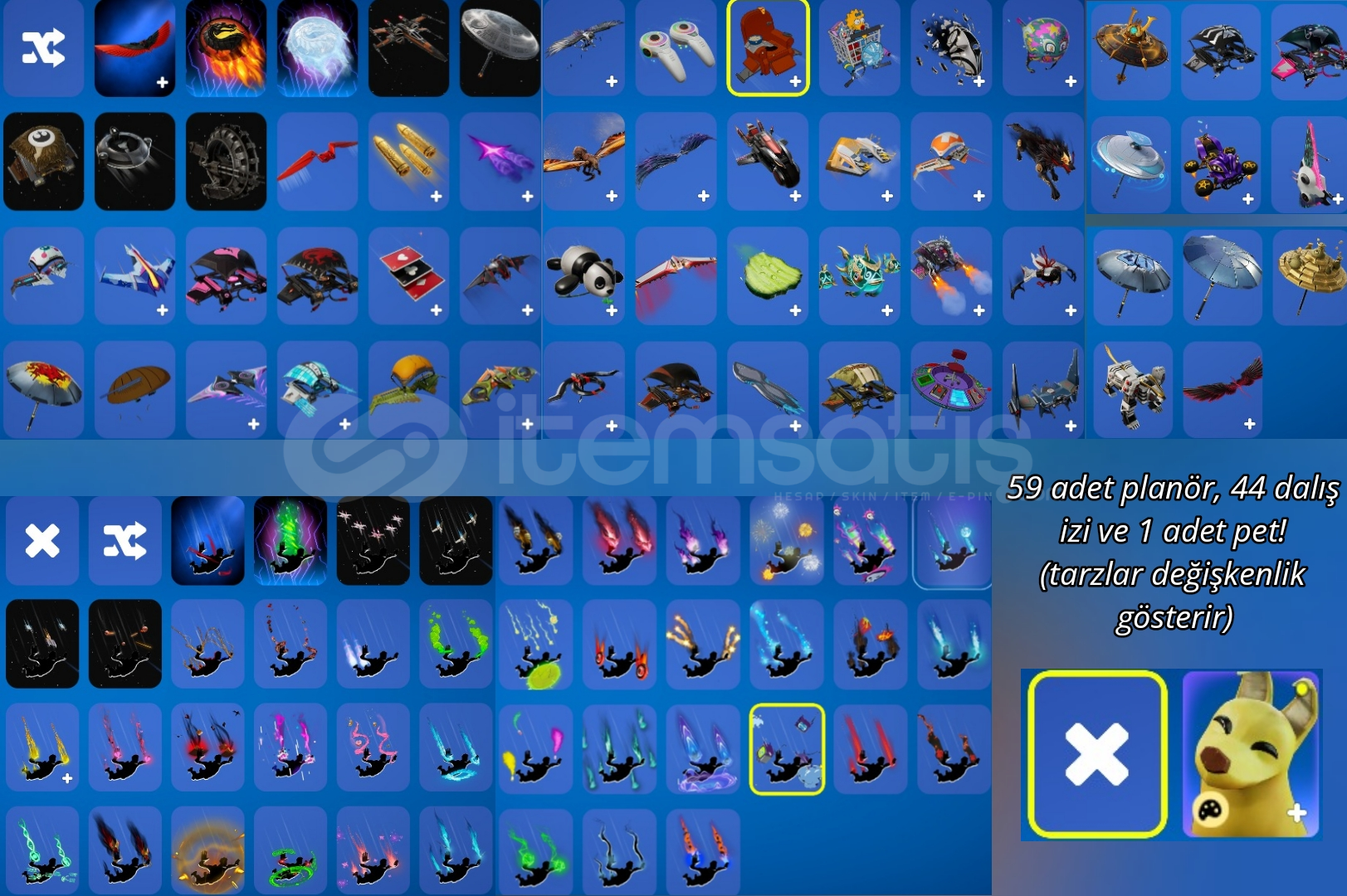Skin: 84, Çanta: 106, Kazma: 100, Planör: 59, Dalış izi: 44, Aura: 17, Sidekick(pet): 1, İfade: 73, Sprey: 105, Emoji: 57, Silah kaplaması: 51,