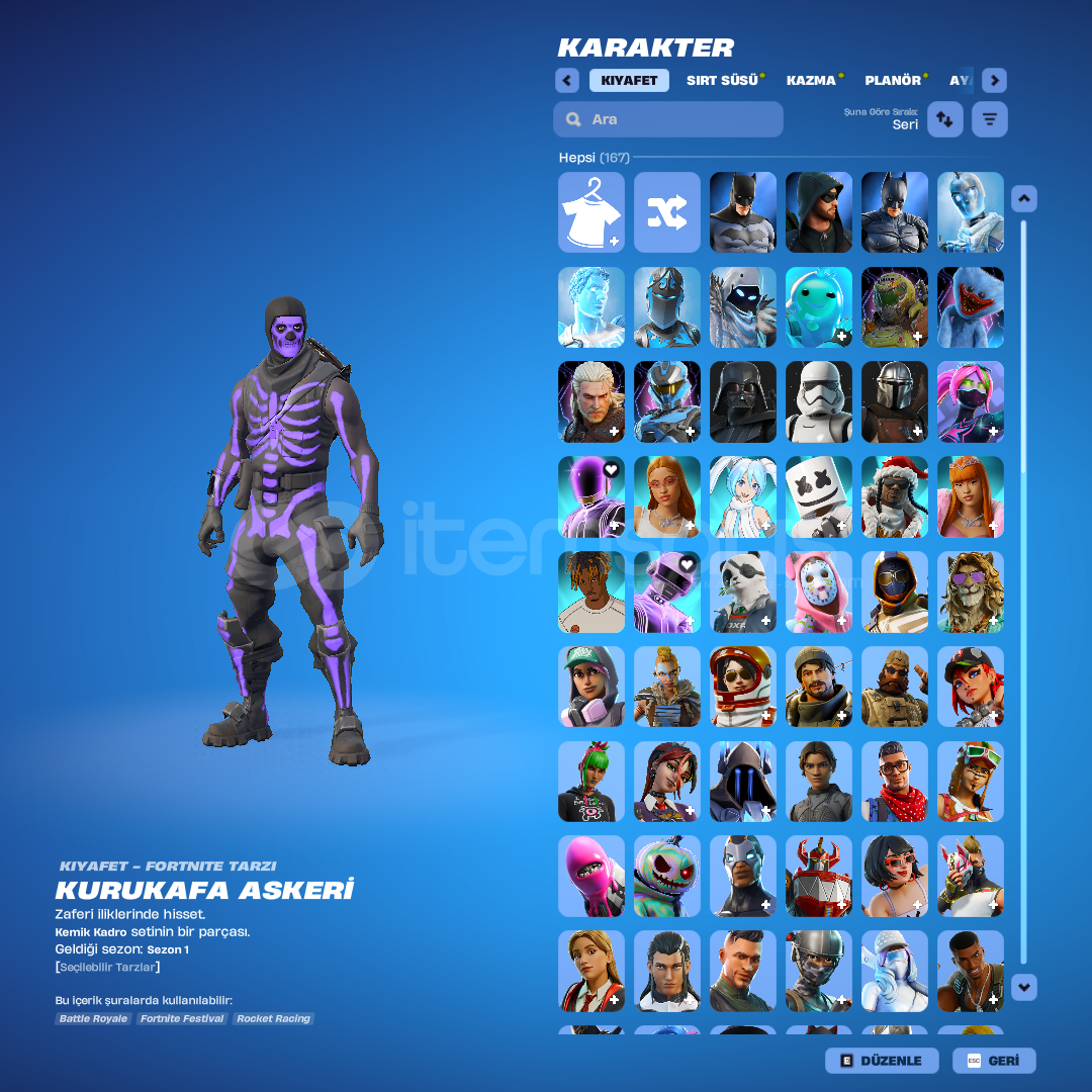Bu hesap uzun süredir aktif olarak oynanan, koleksiyon değeri yüksek bir Fortnite hesabıdır. İçerisinde artık oyunda elde edilmesi zor olan birçok eski sezon Battle Pass karakteri ve nadir içerik bulunmaktadır. Para konusunda sıkıntı etmiyorum. İlgileniyorsanız yazabilirsiniz. (Troll, gereksiz veya hesap ile ilgisi olmayan mesajlara kesinlikle dönüş yapmayacağım.)