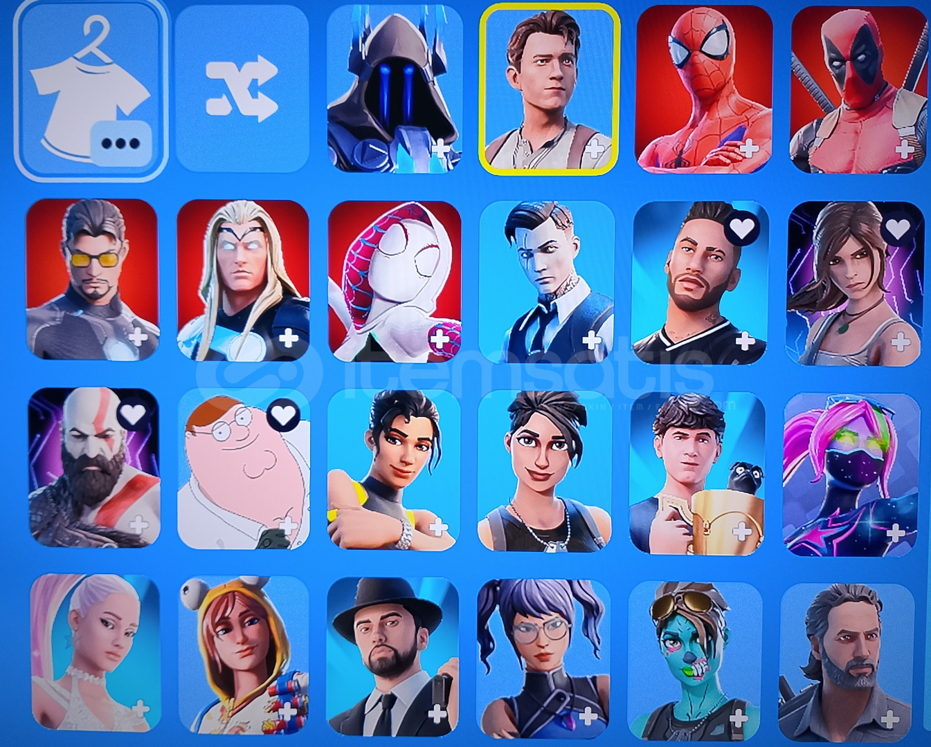 Kratos, lara croft, tony stark, ragnarok, ice king, midas, neymar, ghoul trooper, Ch3 spiderman