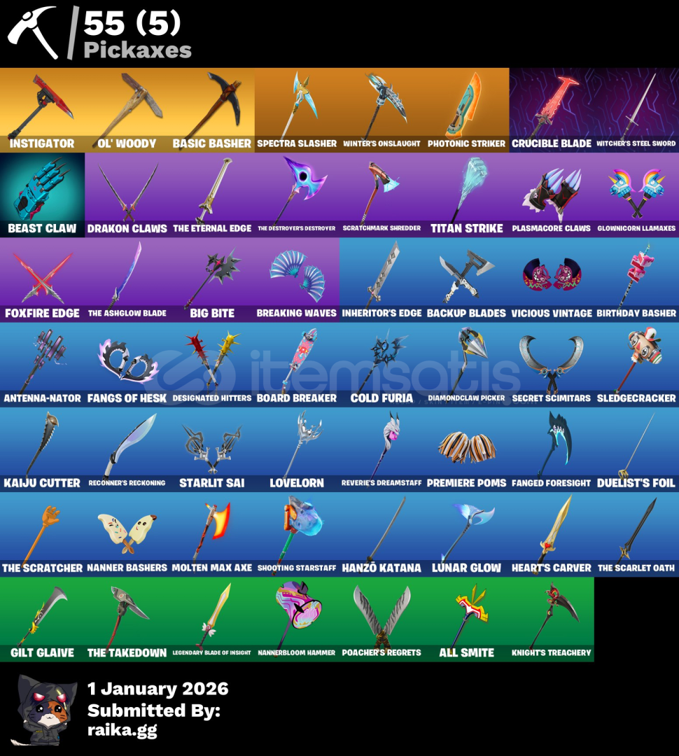 Nadir Öğeler: Artık alınması imkansız olan OG Twitch Prime Paketi (Havoc & Sub Commander) ve Instigator Kazması bulunmaktadır.Skin Sayısı: 48 Adet (Görsellerde tüm detaylar mevcuttur).Popüler İş Birlikleri: Geralt of Rivia (The Witcher), Doom Slayer, Peter Griffin, All Might, Eren Jaeger (Attack on Titan), The Weeknd.Battle Pass: Birçok sezonun Battle Pass öğeleri fulllenmiştir (The Ageless, Renzo, M...