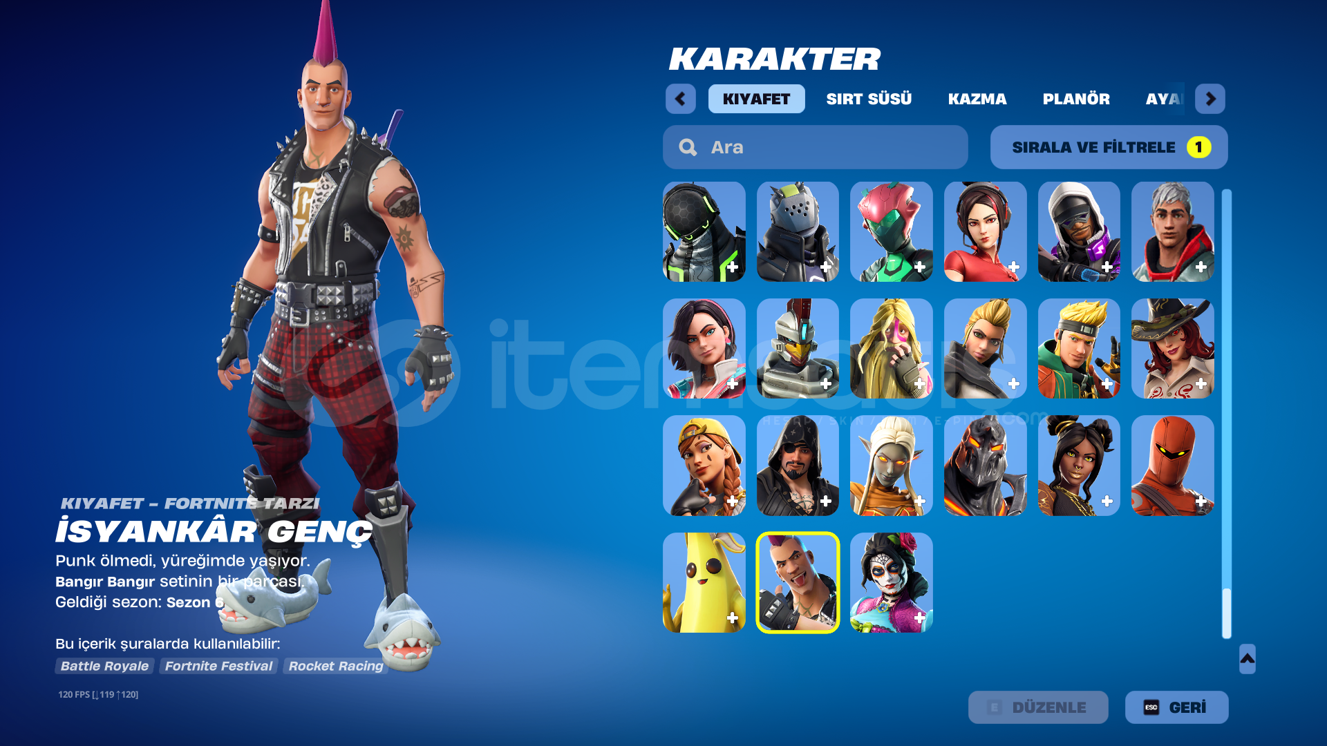 Sezon olarak savaş bileti açık ve fullSorunuz olursa sorabilirsiniz.Karakter detayları için, https://fortnite.gg/locker?i...