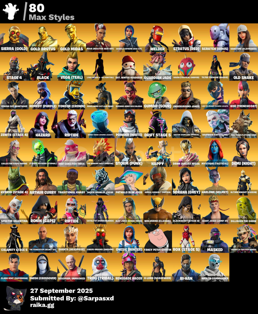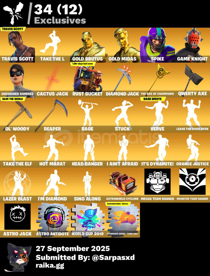 50+RARE SKIN VE TARZI(BAZILARINDA OYUNDA GORMEDIGINIZE EMIN OLDUGUM TARZLAR VAR)Take The L - Rage - Stuck(banlı) - Verve(limited rare) - leave the door open - take the elf - hot marat - head banger - I aint afraid - its dynamite - orange justice - im diamond sing along VE DAHA FAZLASI NADIR EMOTELAR VE ESKI SEZON EMOTELARI DOLU TOTAL 217 EMOTERARE SKINLER VE TARZLARI MEVCUT RARE KAZMALAR OG STW KAZMALARI DAHIL MEVCUT(EN UZUN SUREDIR GELMEYEN KAZMA DAHIL)RARE BACKPACKLER TARZLARI MEVCUT(EN U...