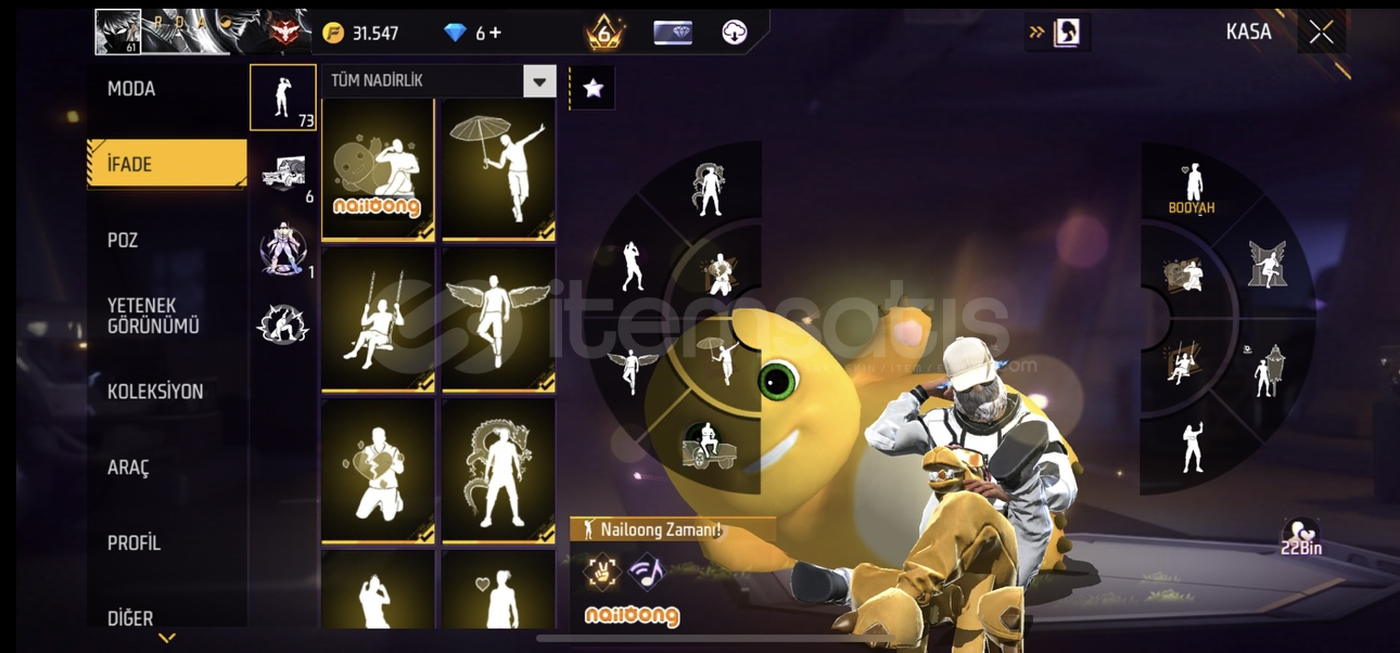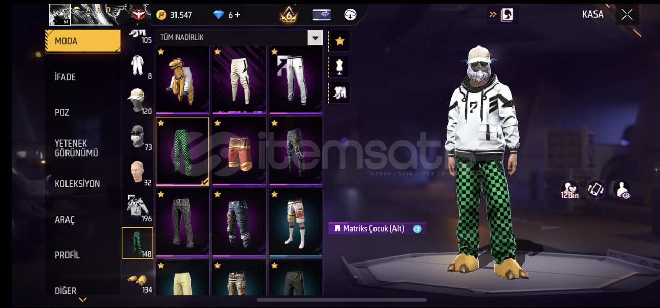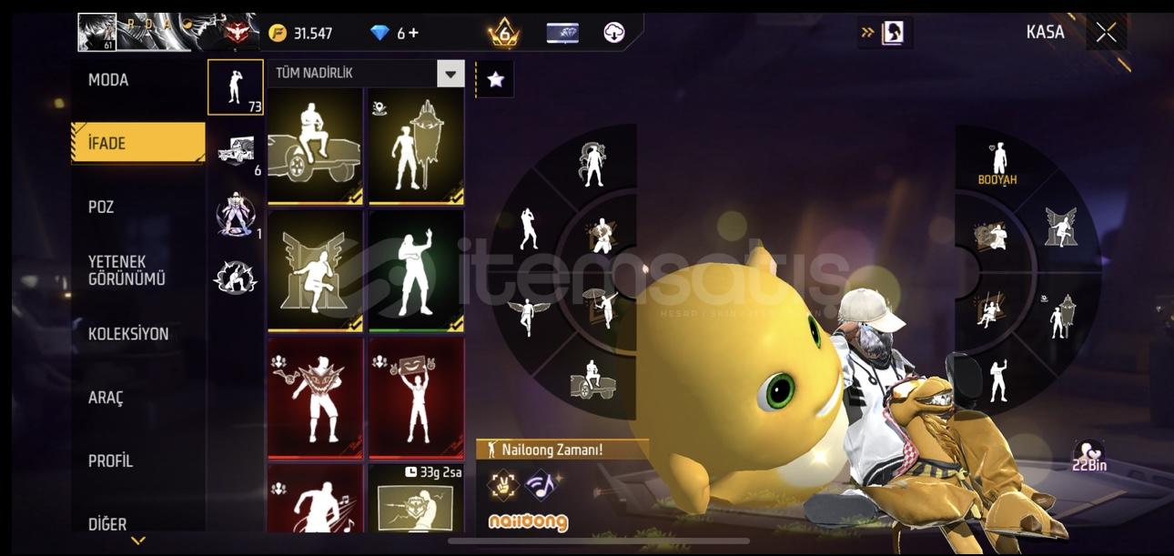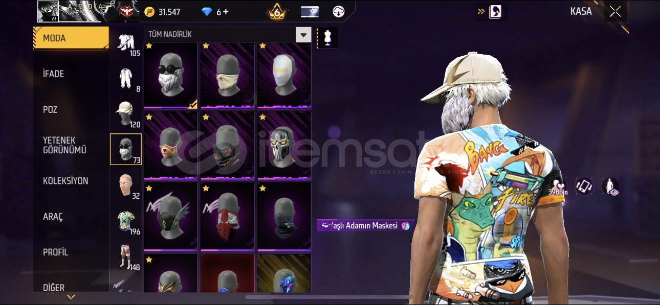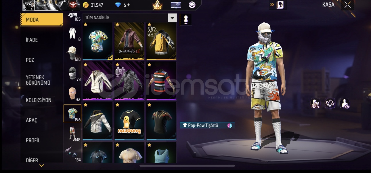 Hesap ifade bakımından doludur.80 civarında ifade vardır hepsi kaliteli ifadelerdir9 evo ve birsürü atolye silah desenleri vardırbeyaz maske, dede sakalı gibi özel eşyalar vardır.Altın kanunsuz, mavi kanunsuz, melek dino vardırdeve pantolonu, meşek maskeleri, melek terliği gibi önemli eşyalar vardır. Araba, motor vb desenleri güzeldir.3-4 tane caz pantolonu vardırŞeytani Dürtü G&oum...