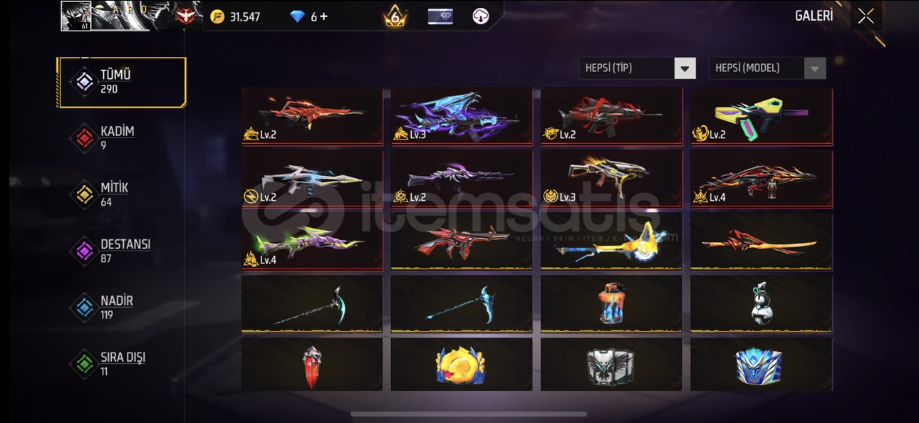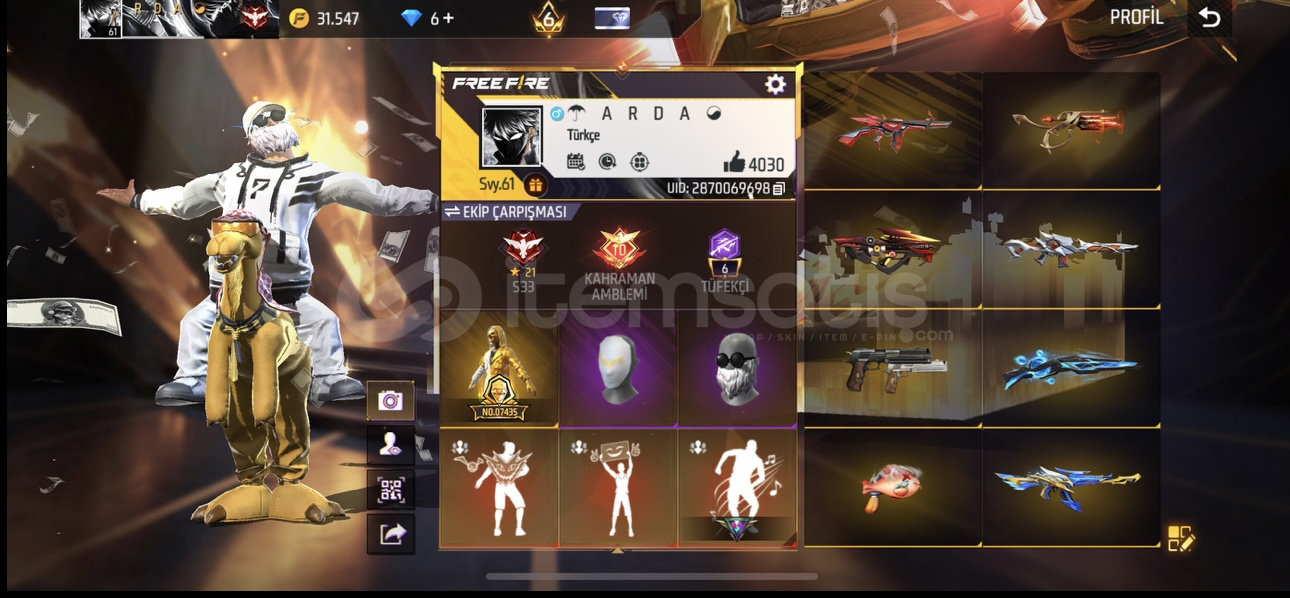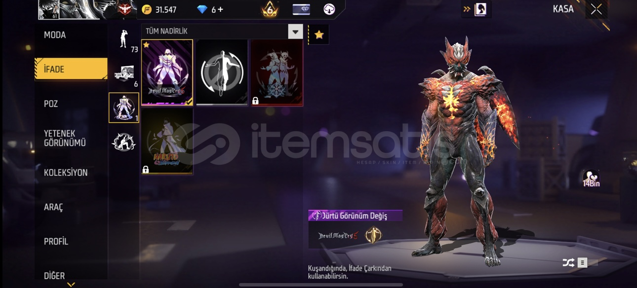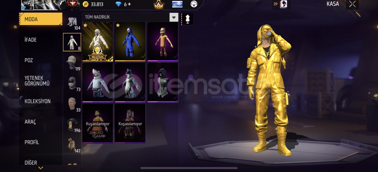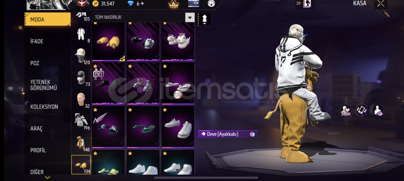 Hesap ifade bakımından doludur.80 civarında ifade vardır hepsi kaliteli ifadelerdir9 evo ve birsürü atolye silah desenleri vardırbeyaz maske, dede sakalı gibi özel eşyalar vardır.Altın kanunsuz, mavi kanunsuz, melek dino vardırdeve pantolonu, meşek maskeleri, melek terliği gibi önemli eşyalar vardır. Araba, motor vb desenleri güzeldir.3-4 tane caz pantolonu vardırŞeytani Dürtü G&oum...