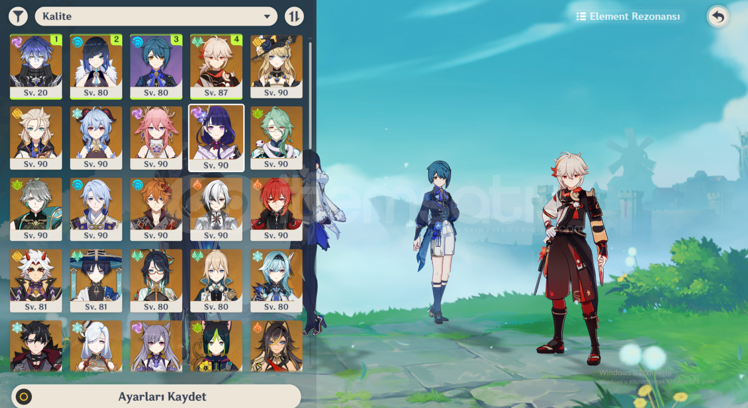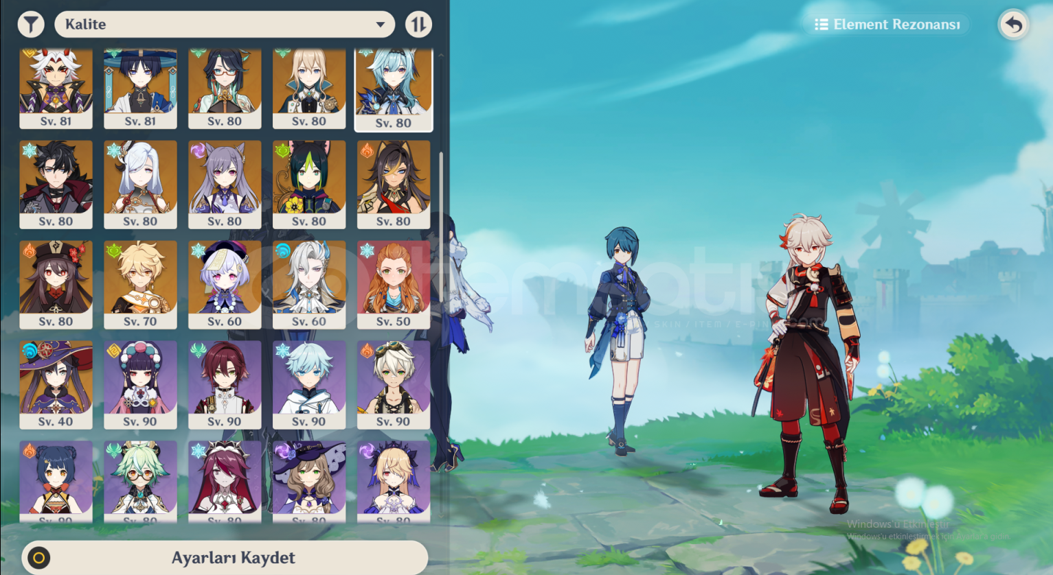 Hesapta standartlar hariç 21 tane 5 star karaker ve 13 tane 5 star silah vardır. mapın büyük bir kısmı yapılmamış wish kasmaya uygundur. hesapta C6 ayato C6 diluc C1 Hu tao vardır.