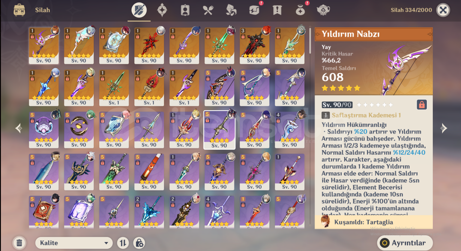 Hesapta standartlar hariç 21 tane 5 star karaker ve 13 tane 5 star silah vardır. mapın büyük bir kısmı yapılmamış wish kasmaya uygundur. hesapta C6 ayato C6 diluc C1 Hu tao vardır.Karakterlerin çoğu buildlidir ve hesapta bol bol arti vardır. 4 starların neredeyse hepsi c6dır. oyunu cok uzun bir süredir oynamadıgım icin satıyorum.