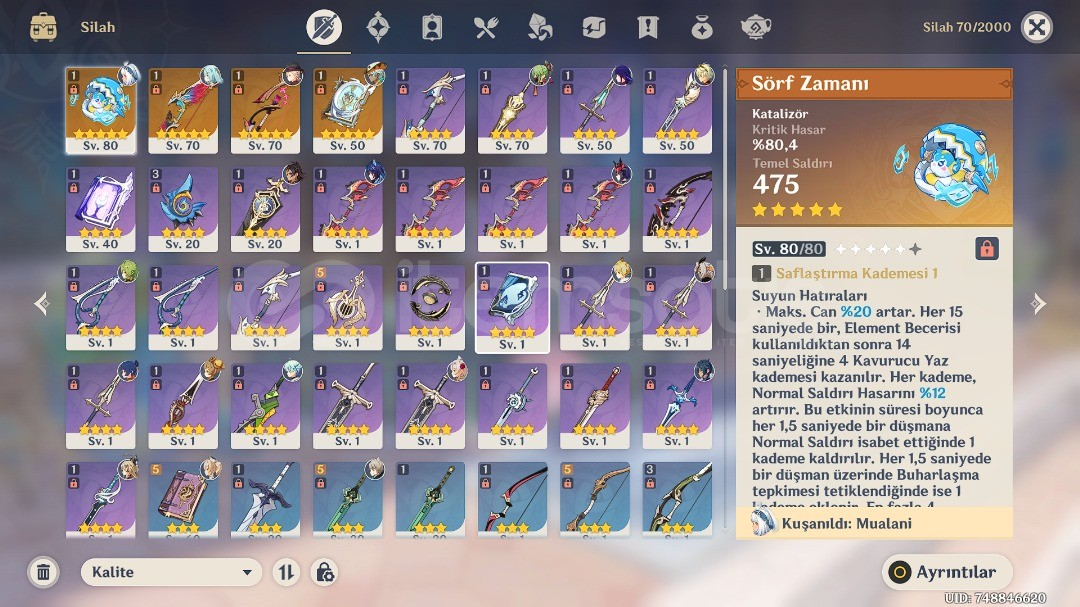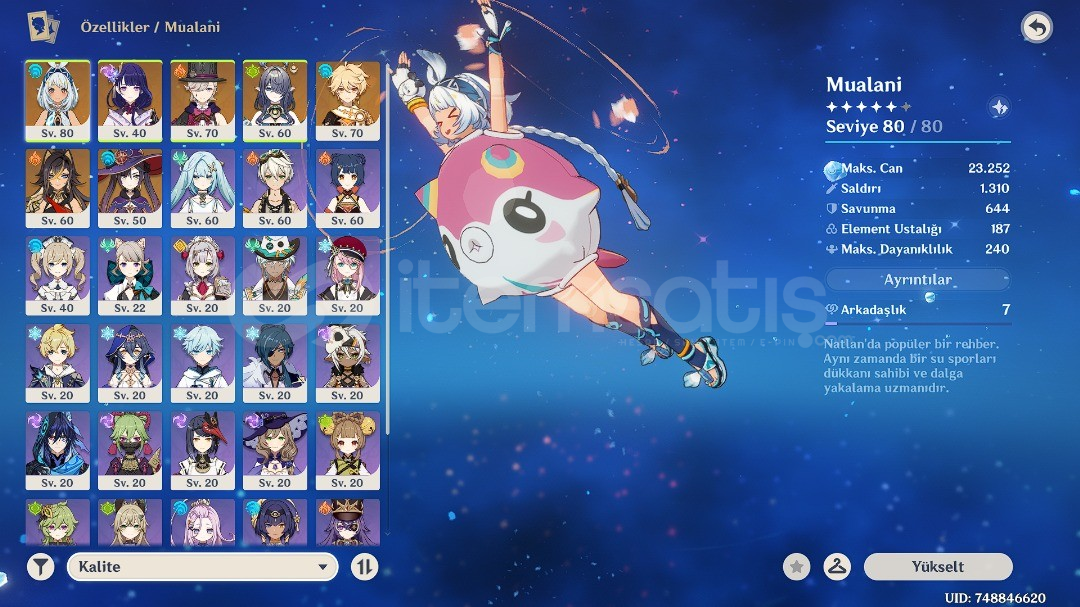 Hesapta 10 adet beş yıldızlı bulunmaktadır. bunlar:mualani+bislyney+bisraidenlaumamonadehyachascanın silahıkutsal rüzgarların kayıp duasıdır. 80+ kırılgan reçine var. Herhangi bir ölü bağlantı yok. Natlanda 4 bölge full diğer natlan bölgeler açılmadı bile. Keşifler şu şekilde:Monsdstadt %50-70Liuye %30-50İnazuma %5-15Sumeru %10-20Fontaine %0-20Cheny...