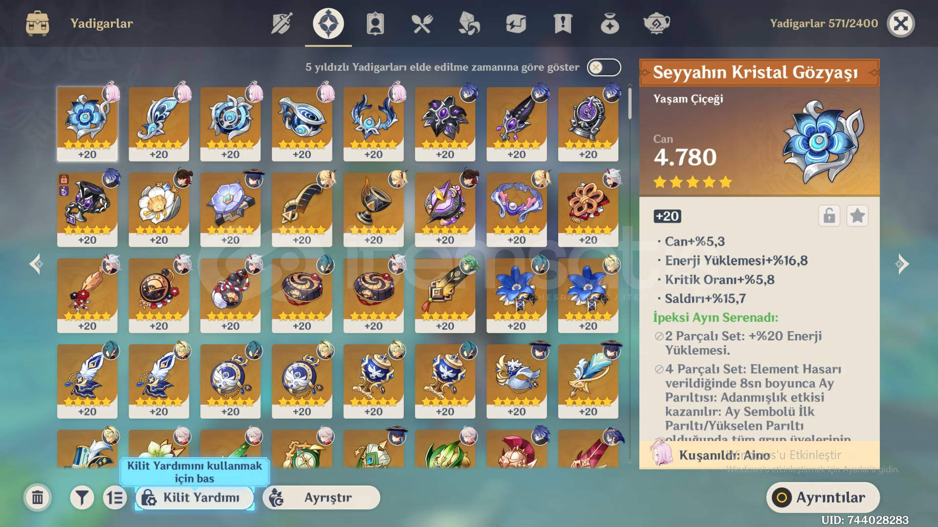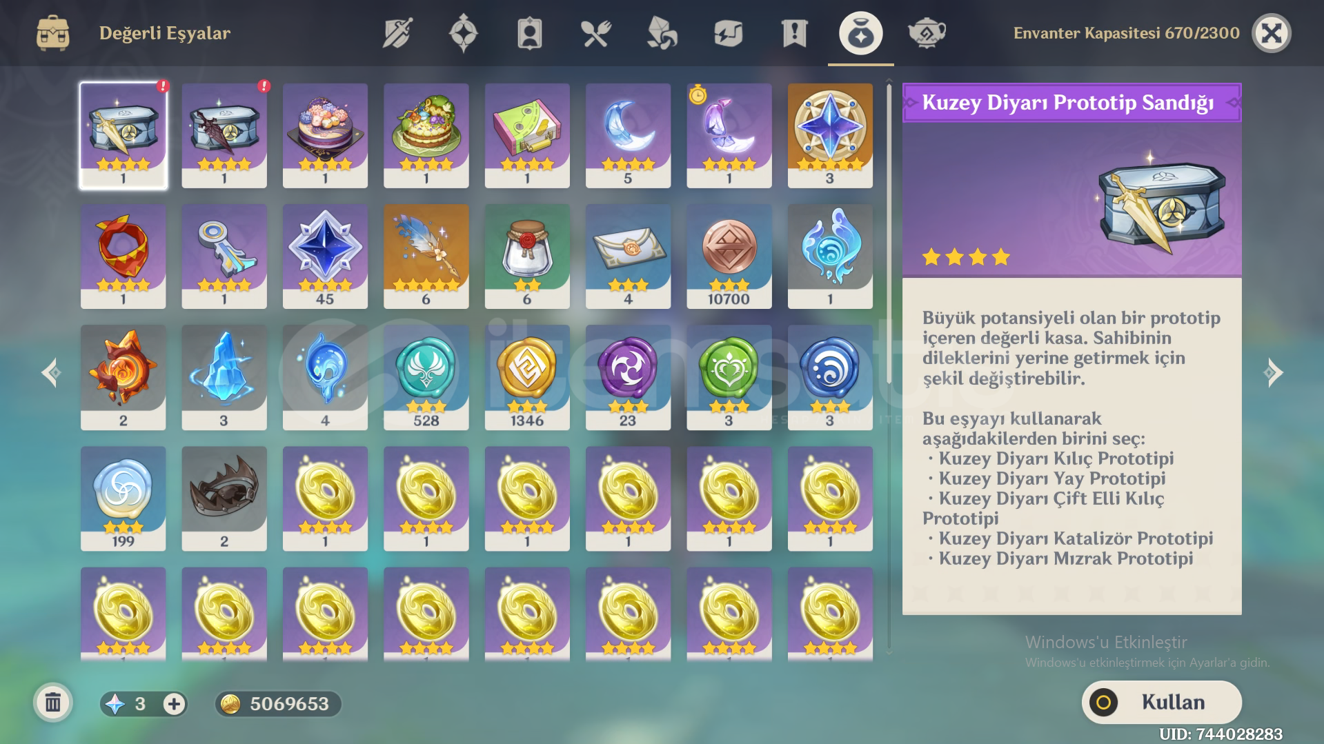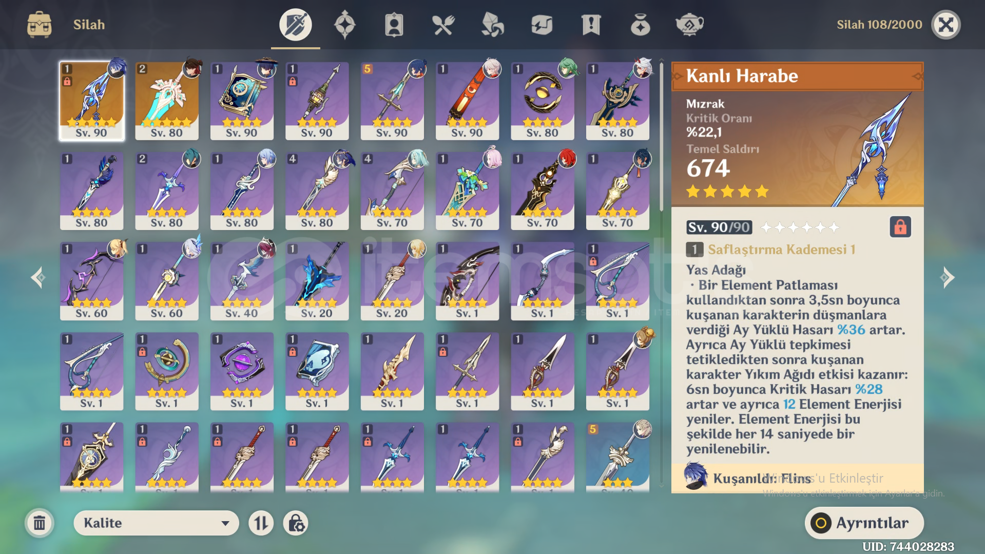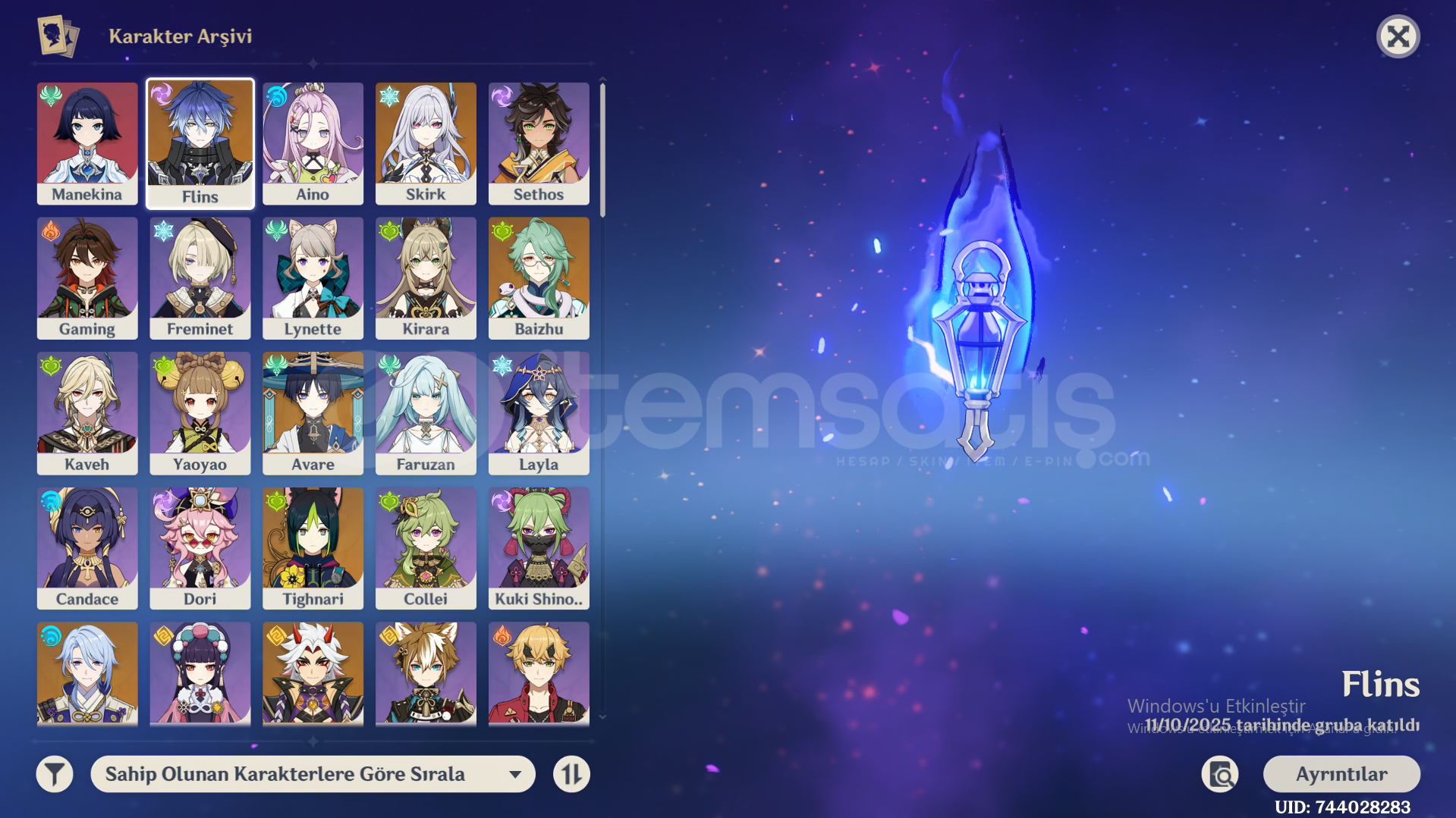 Hesapta,FlinsWandererKazuhaIttoAyatoSkirkTighnariMonaDiluc (C 1)Qiqi (C 1)AlbedoBaizhuBulunmaktadır.Flins'in kendi mızrağı da mevcut ve kasılı halde.Hesap Ar 55 ve Europe serverda.Hesap e posta ile teslim edilecektir, önlem amaçlı satın alırken ekran kaydı almayı unutmayın.