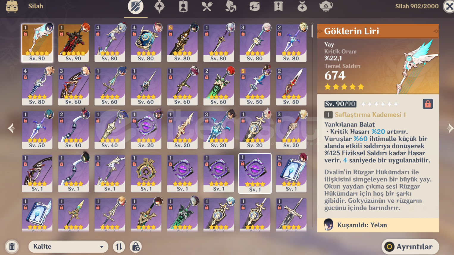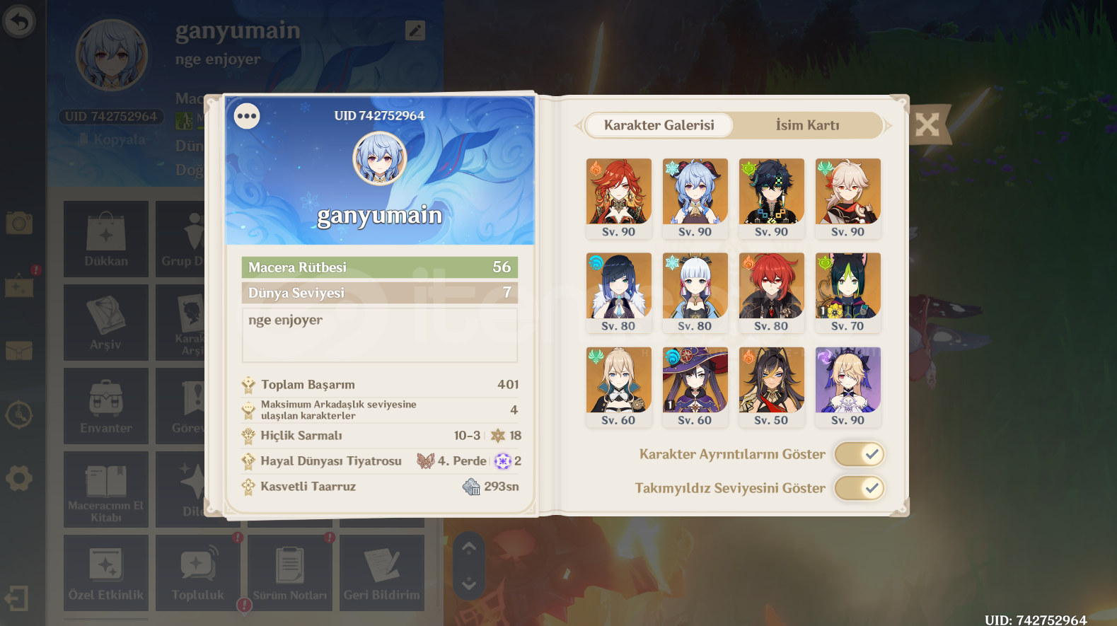 pazarlık yapılır, detayları fotograflardan gorebilirsinizhesapta yelan, mavuika, ganyu, kazuha, ayaka, kinich bulunur, ek olarak c1 mona, c1 tighnari ve c1 qiqi var.silah olarak kurdun mezar taşı ve göklerin liri var.haritalar boş cogu yer 40-50 arası ve enkanomiya hiç açılmadı, natlan ve nod krai yarisina kadar acilmis 20-30 arası rahatlıkla wish kasabilirsiniz.archon quest sumeruda olması lazım.60-70 ...