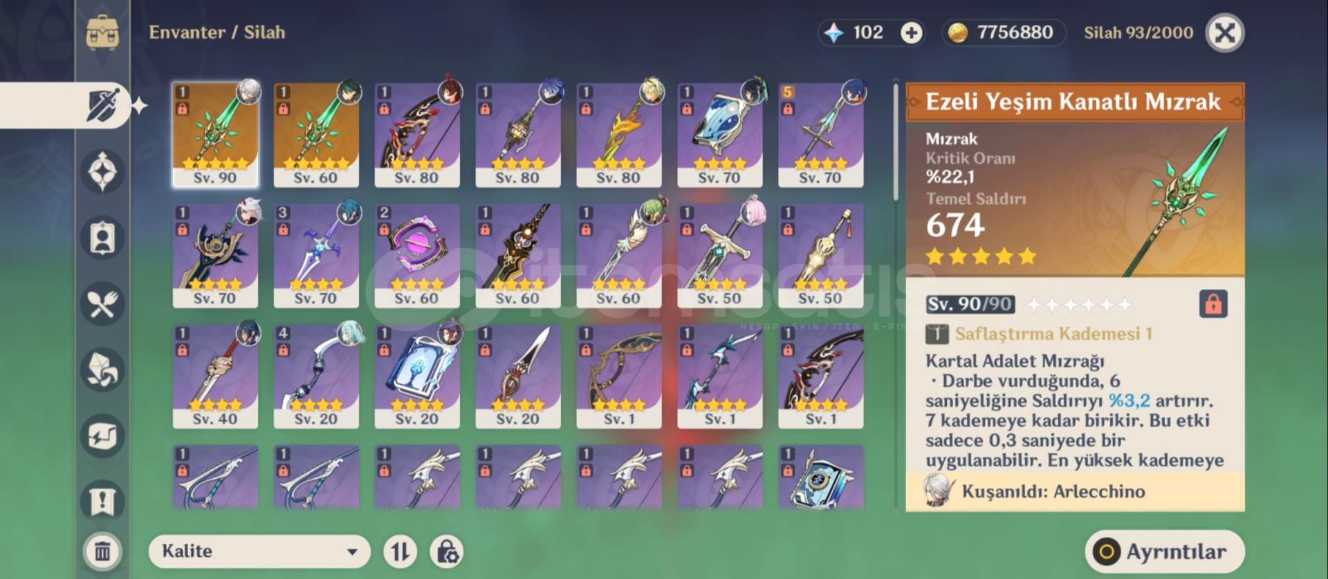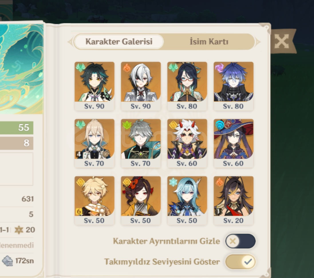 karakterler ve silahlar fotograflarda gorundugu gibidir en son flins cikarilmistir karakterlerin buildleri iyidir zorluk cekmeden oynayabilirsiniz bolgelerin kesif oranları 75'in uzerindedir natlan ve nod krai acilmamistir, kolaylikla primo kasabilirsiniz.