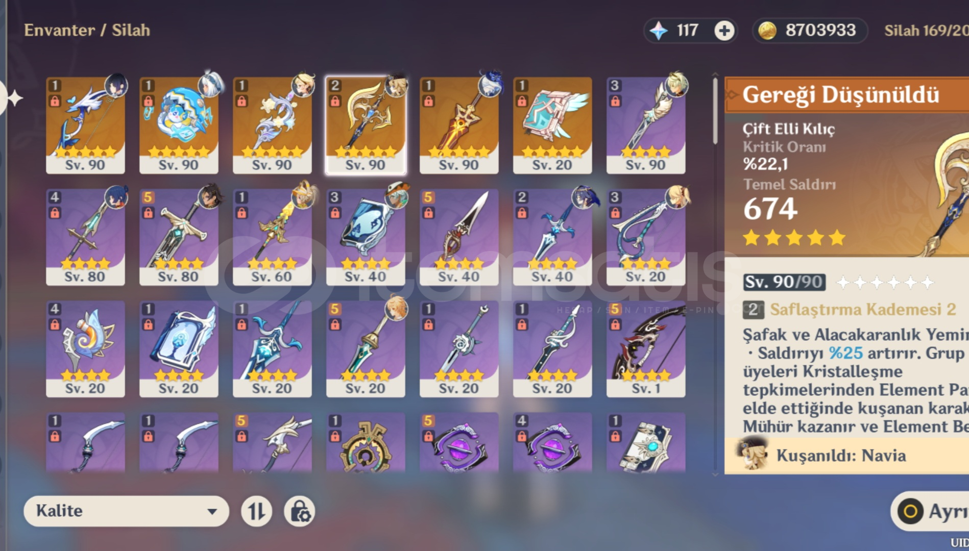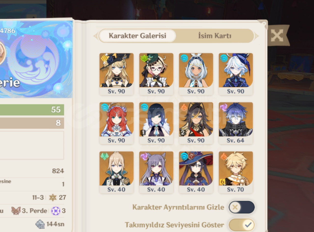 karakterler ve silahlar fotograflarda gorundugu gibidir nod krai ve natlan haric butun bolgeler fullenmistir karakter buildleri cok iyidir zorluk cekmeden abyss ve tiyatro donebilirsiniz ek olarak hesap ta C1 yelan, R2 navia imza silahı, nilou ozel skin bulunmaktadır.