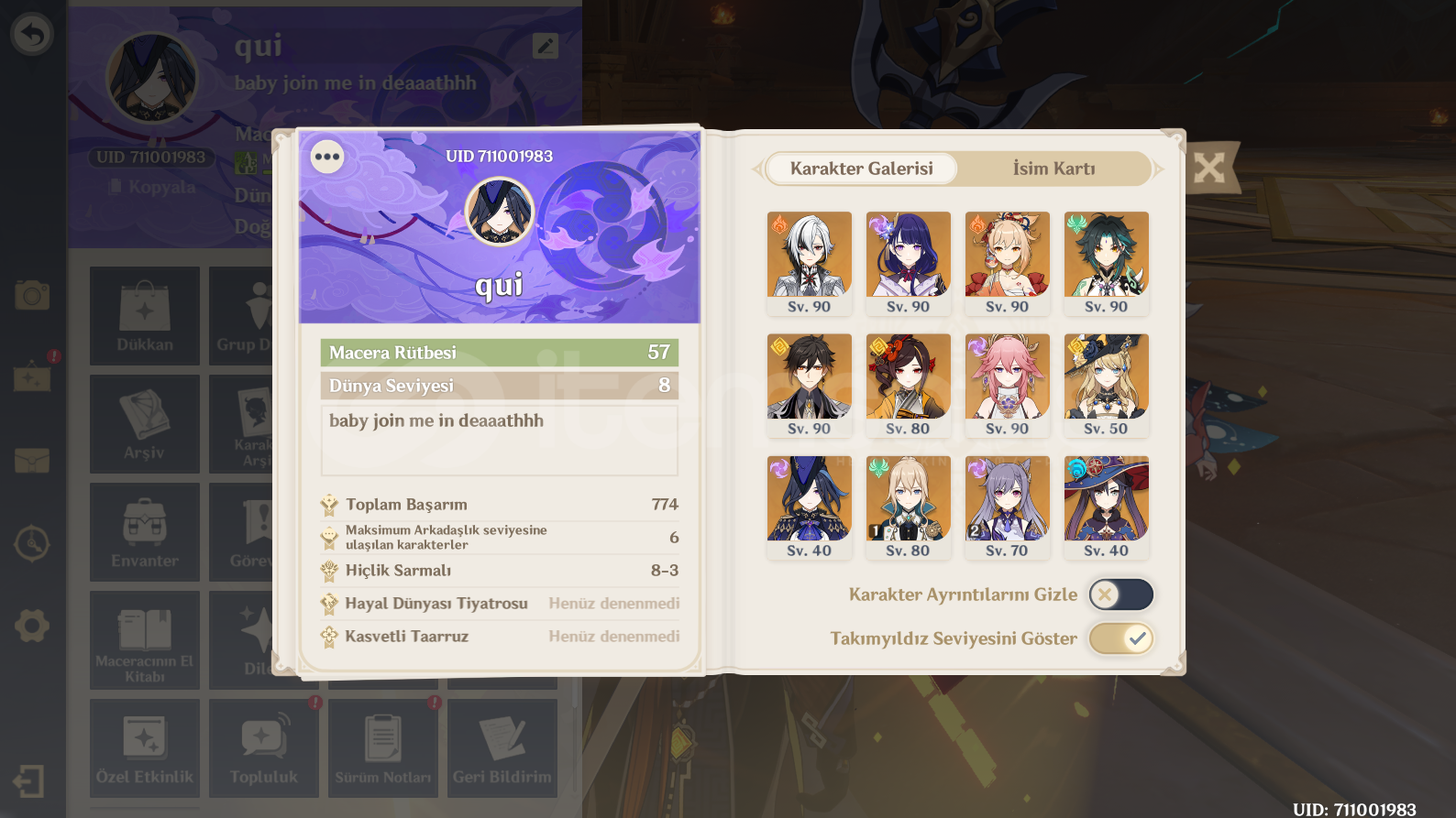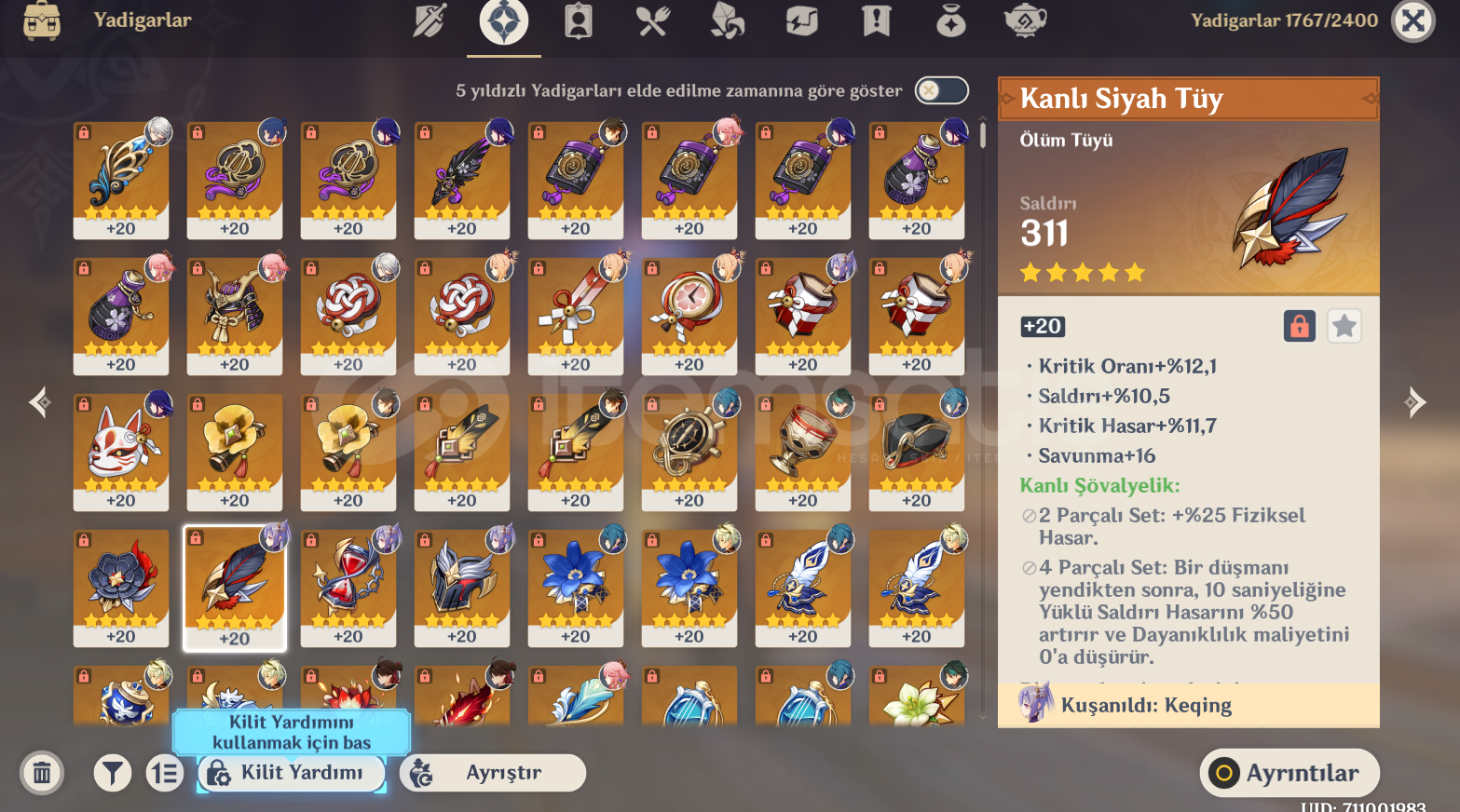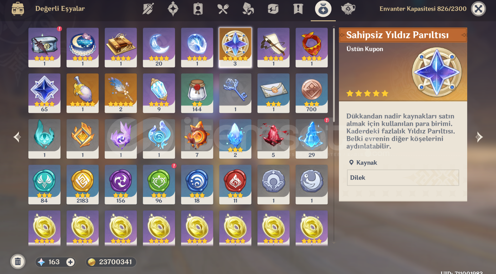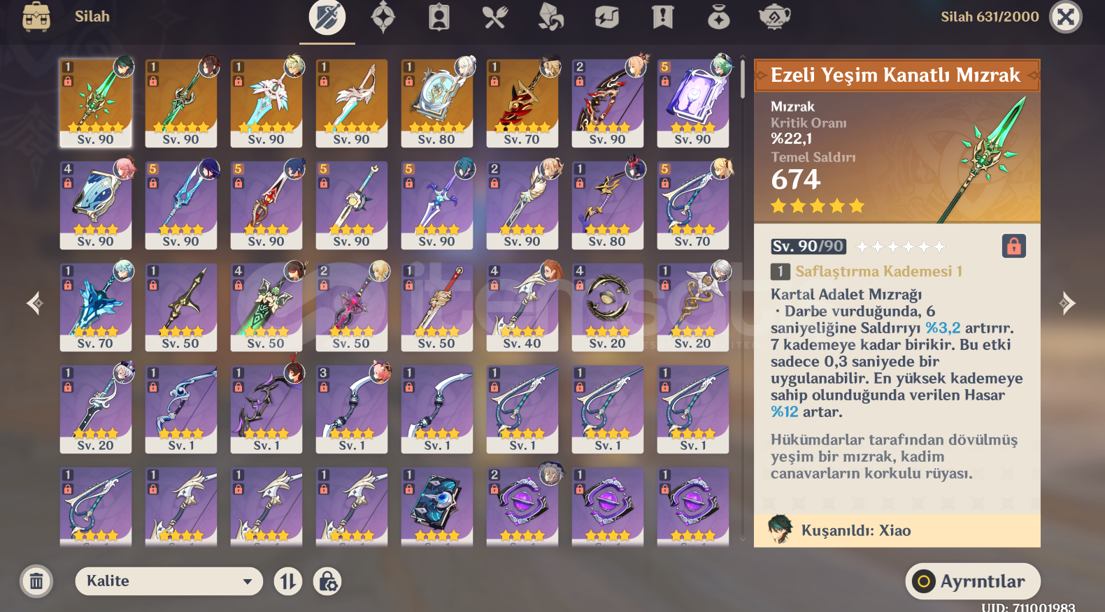 pazarlık yapılır, detayları fotograflardan gorebilirsiniz.C0 arlecchinoc0 raidenc0 yoimiyac0 xiaoc0 zhonglic0 chioric0 yae mikoc0 naviac0 clorindec1 jeanc2 keqingc0 monac0 qiqic0 dehyac0 tighnarisilah olarak:Ezeli yeşim kanatlı mızrak (xiao bis)Ezeli yeşim kılıcıTaşkıran kızılboynuz (itto sig)Favonia KartalıKutsal ruzgarlarin kayıp duasiGoklerin kılıcıNatlan ilkgelen bolge dışında a...