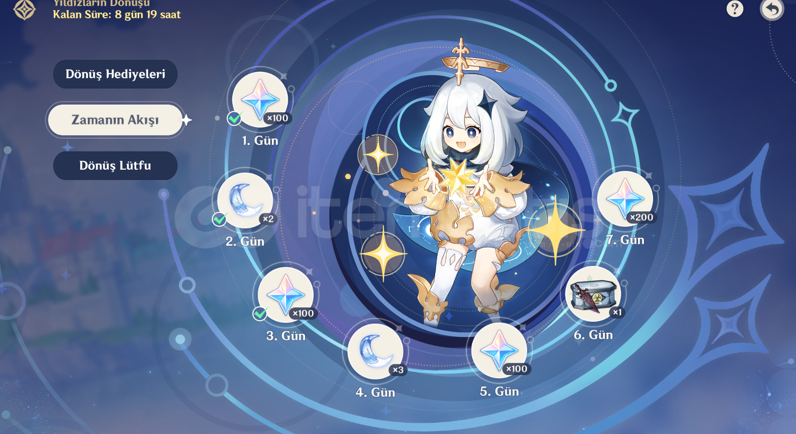 561 tane mor, 585 tane mavi kitap ve 23 milyon mora ayrica 20 tane kırılgan recine var. Heaspta geri donuş odulleri oldugu icin sadece giriş yaparak bile primogem alabilirsiniz.