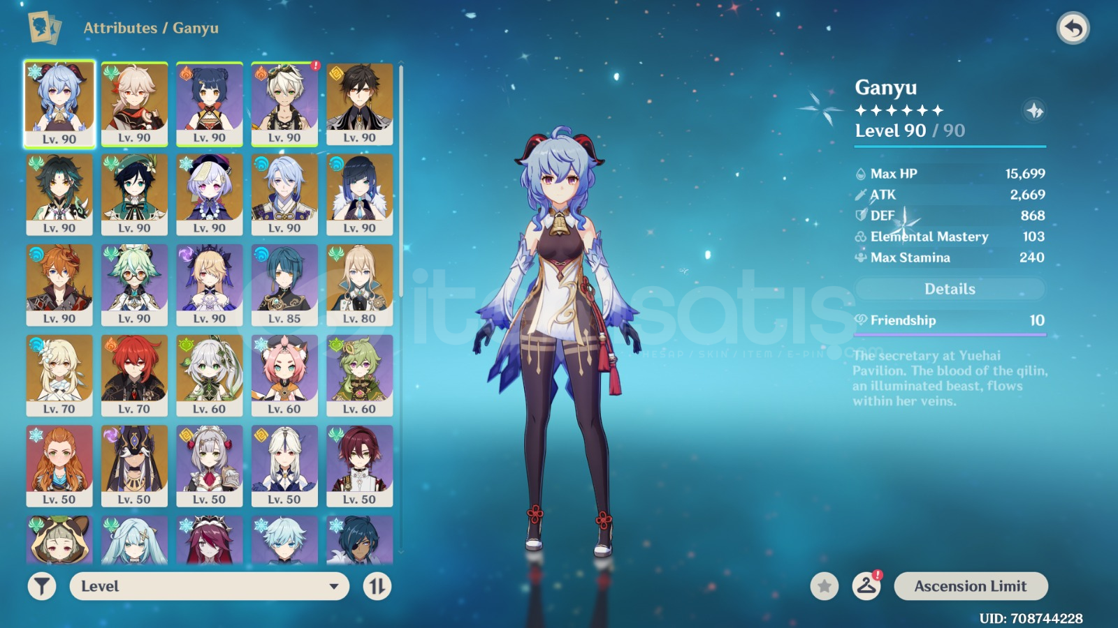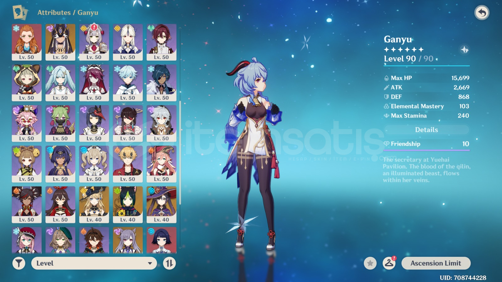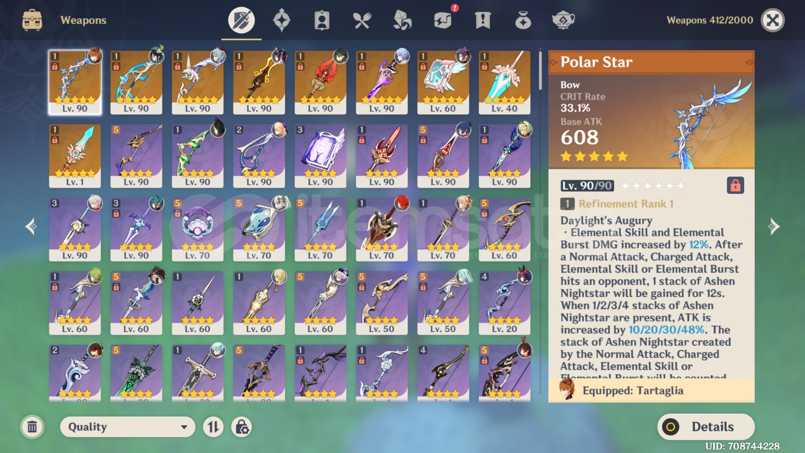 5* Karakterler:C1 GanyuC0 KazuhaC0 ZhongliC0 Xiao C0 Venti C0 Ayato  C0 YelanC0R1 TartagliaC0 NahidaC1 CynoC0 Navia5* Standartlar:C2 TighnariC0 QiqiC0 DilucC0 MonaC0 KeqingC0 Jean5* Silahlar:Staff of HomaElegy of the EndMistsplitter ReforgedAmos BowPolar StarSkyward AtlasSkyward PrideSkyward Spine4* Karakterler:Aloy - C0Amber - C1Kaeya - C2Lisa - C2Barbara - C6Razor - C6Xiangling - C3Beidou - C3Xingqiu - C6Ningguang - C6Fischl - C6Bennett - C5 (C6'ya basabilirsiniz)Noelle - C...