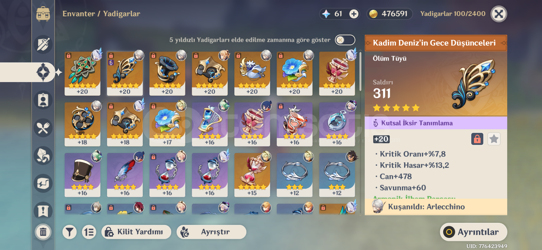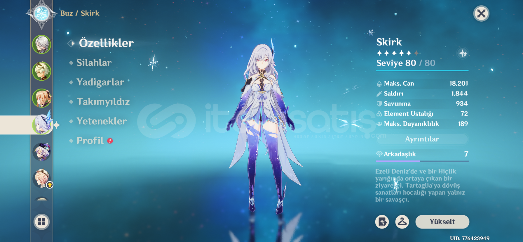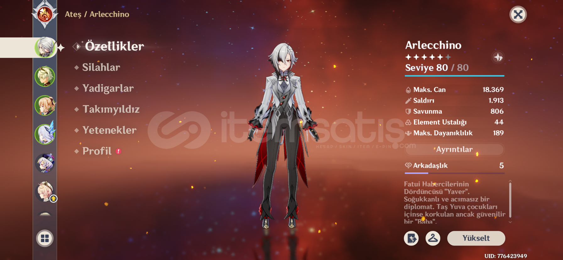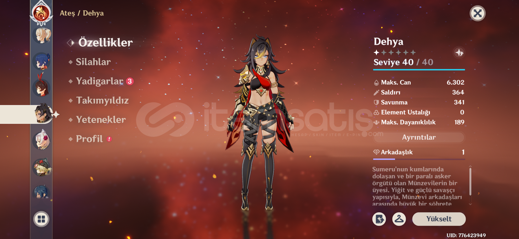 Hesap 48 ar çok guzel yadigarlar var silahlarıda güzel 45 pity 2 kere yeni ayın lütfu alındı içerisinde takım kurmak için güzel 4 yıldızlı karakterler var bennet sucrose gibi ateş ve rüzgar tepkimesini destekleyecek karakterler 5* lı karakterler dehya,jean Skirk , Arlecchino ve qiqi rahatlıkla alabilirsiniz hemen aktif olurum