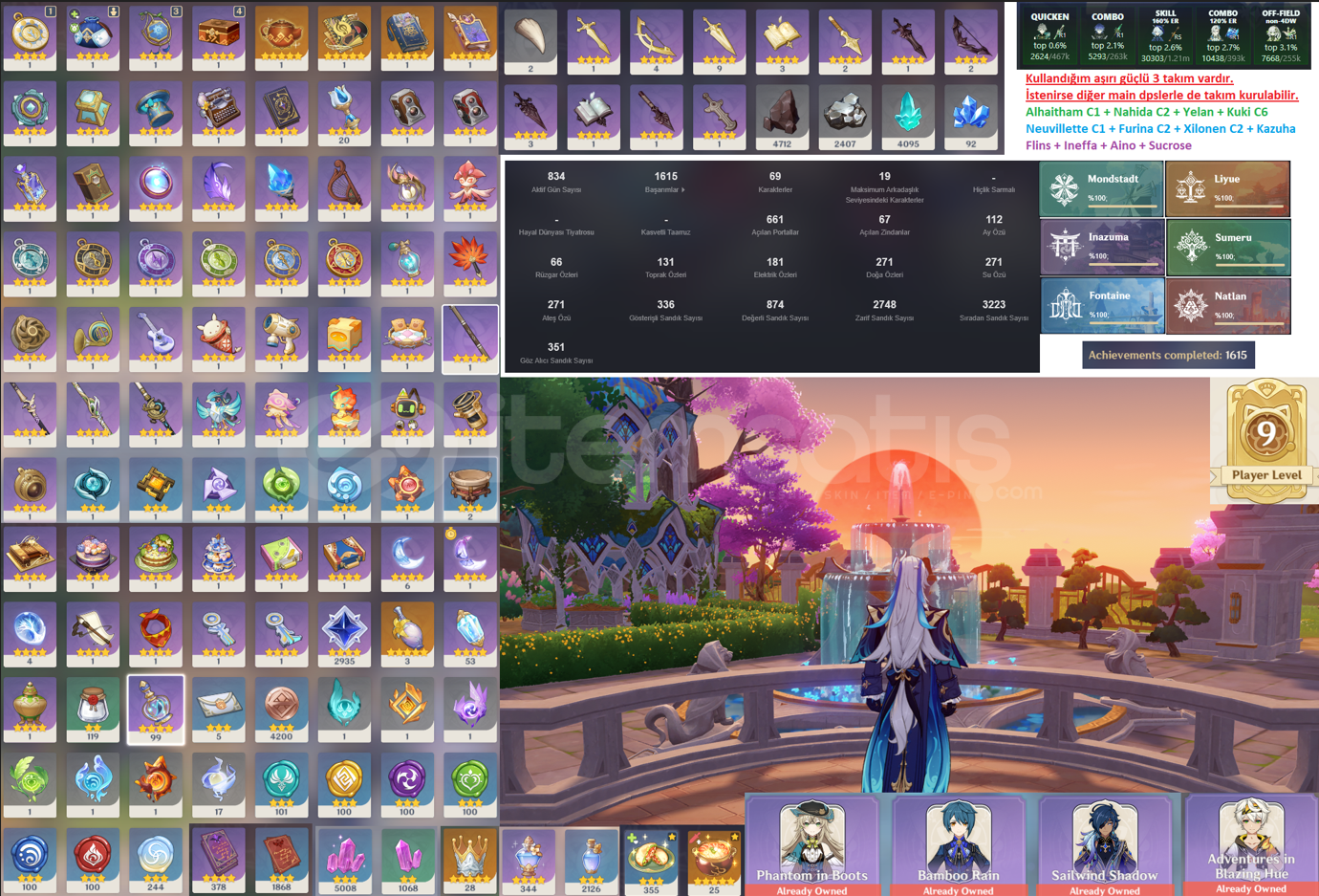 Hesapta takım kurulacak daha çok karakter mevcuttur. Sadece ben 3 ana takıma yoğunlaştım. Diğerlerinin artifactleri de fena değildir.