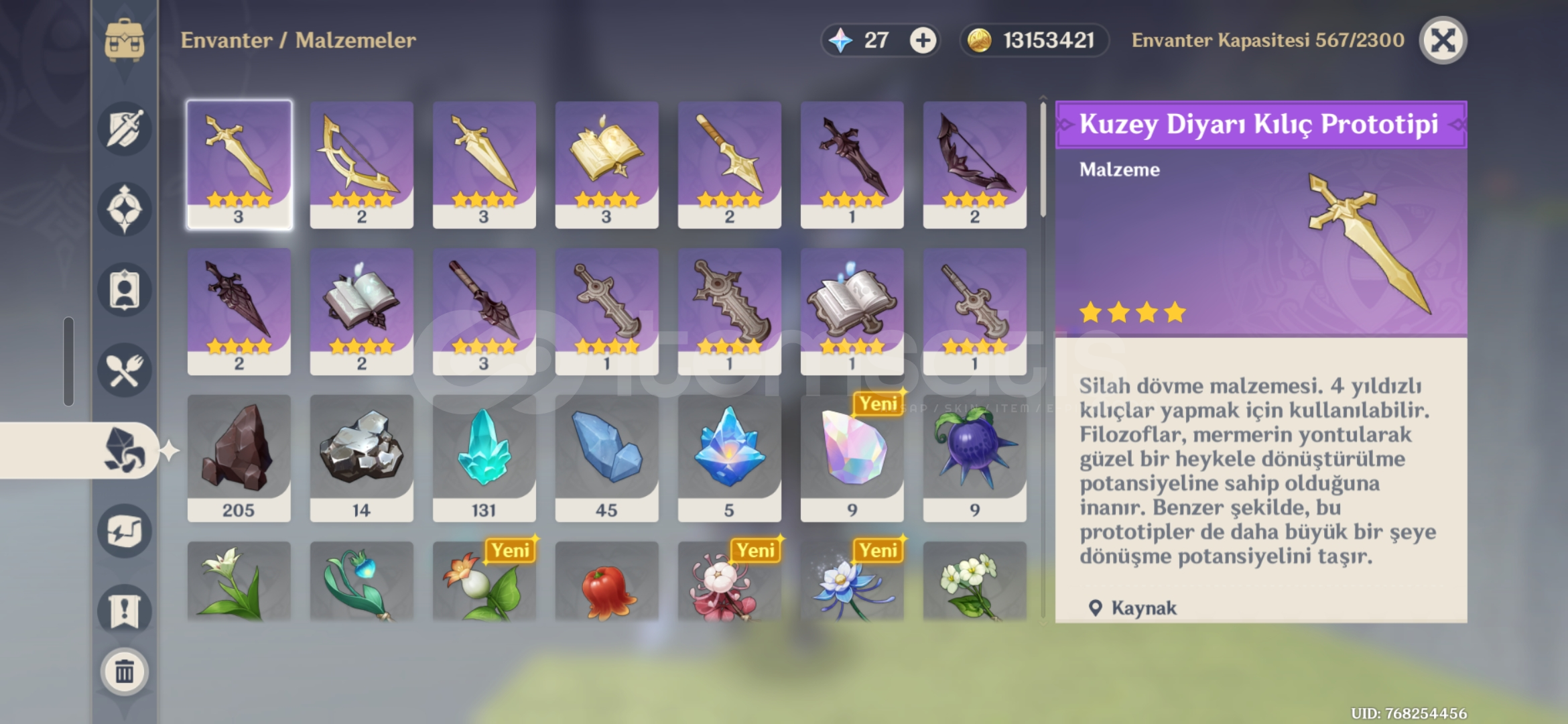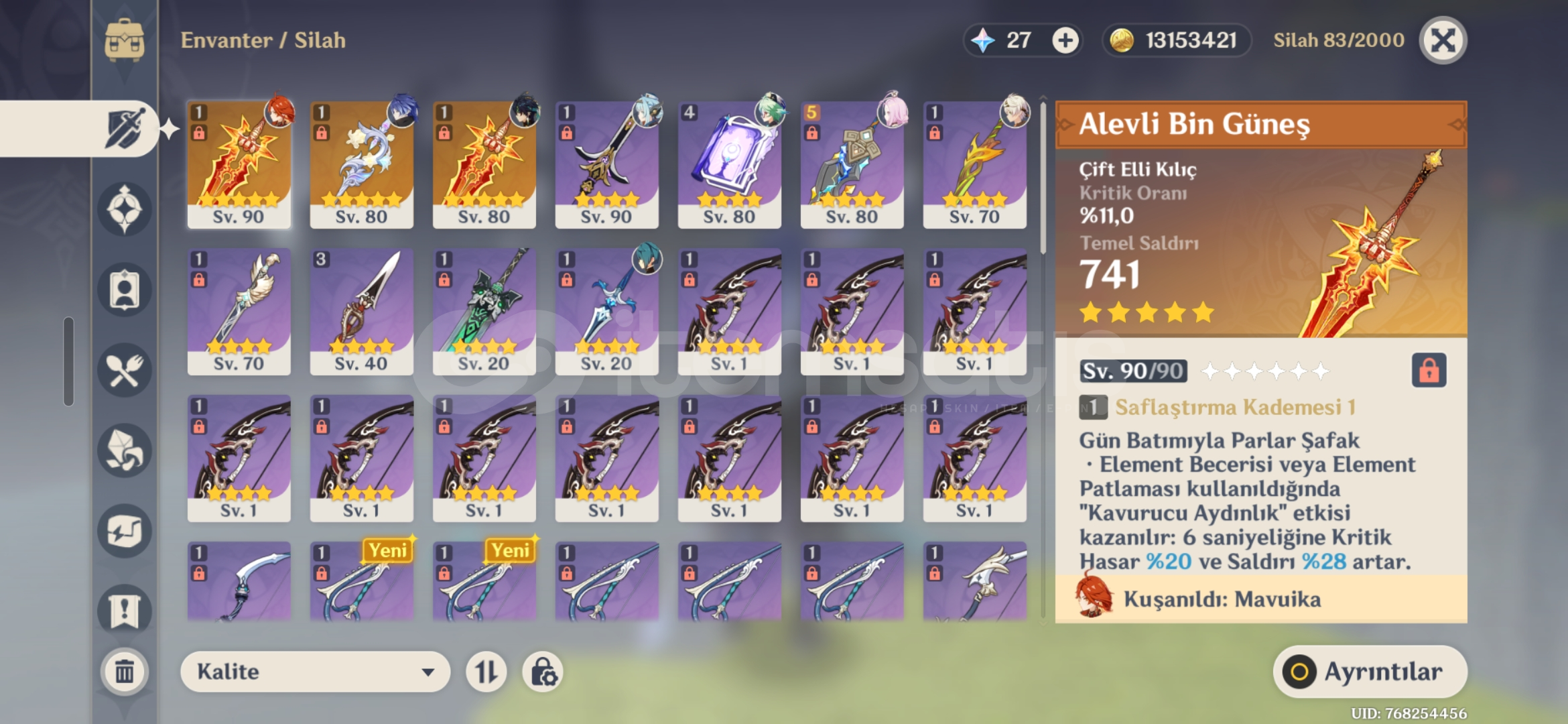 Hesapta flins ineffa mavuika kinich citlali emelie vardir 2 tane mavuikanin kendi silahi ve 1 tane emelienin kendi silahi vardir 13M mora vardir ömrünüz boyunca harcarsiniz :DMail degisimini kayit ile ben yapacagim yeni gelen karakterlerin denemeleri ve yeni gelen nod krai gorevi yapilmadi