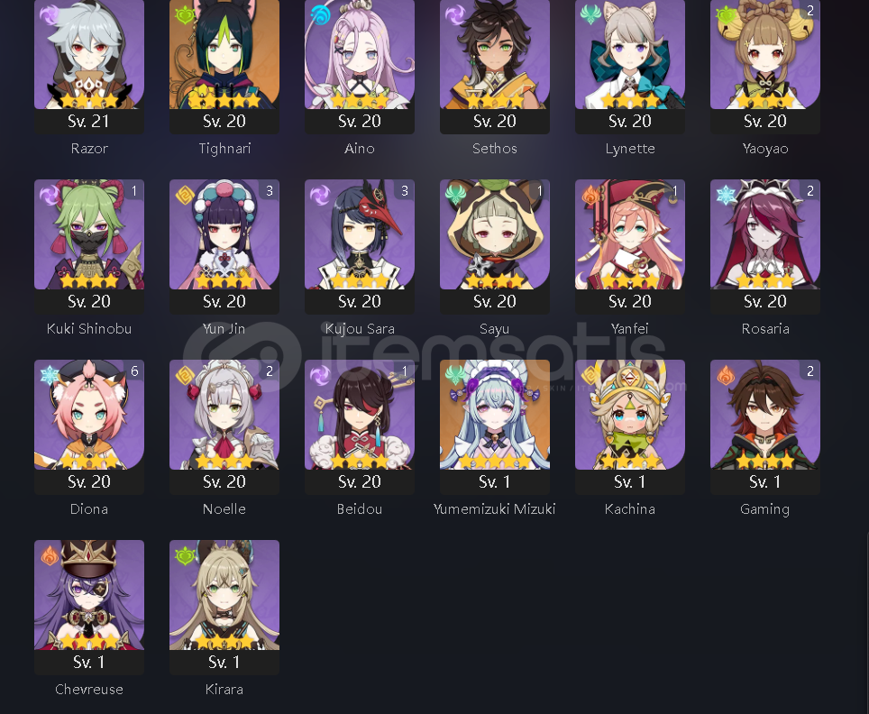 56 karakter var. 65 pity, resin fazla yadigar veya başka bişey kasılabilir, malzemeler de fazla 5 yıldızlı 4 yıldızlı, harita da sadece yeni gelen 2 yer kapalı harici bütün harita açık, hikaye ortalarda fazlaca primo kasılabilir.