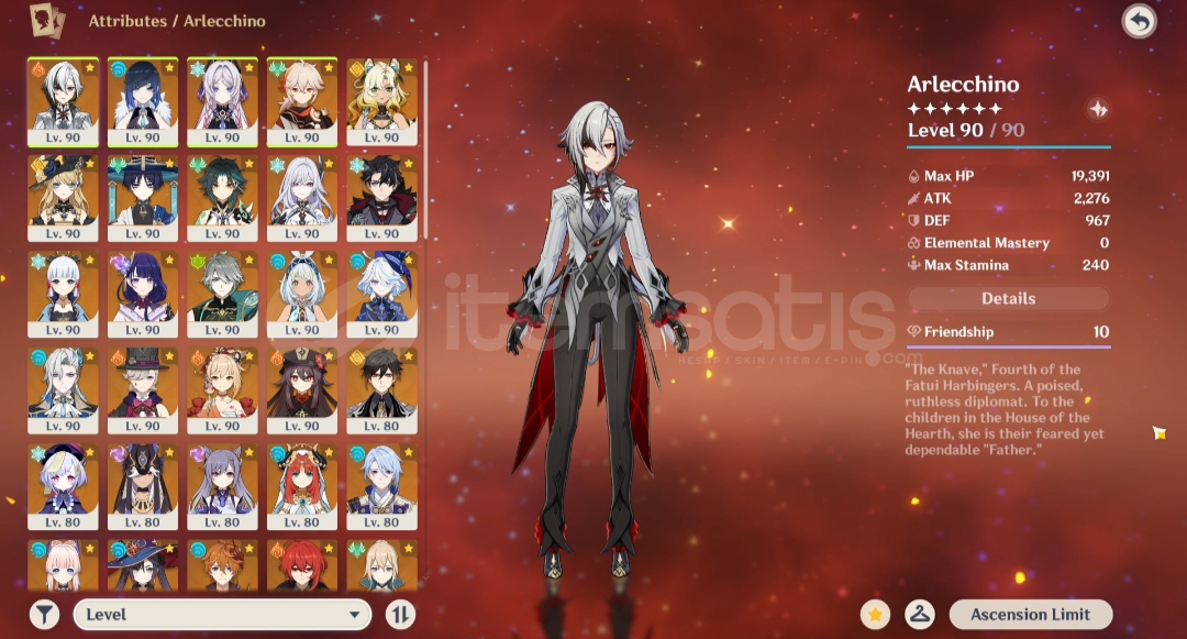 Haritaların hepsi fullenmiş durumda.Artifact açısından çok zengin bir hesap.Rate Up var Pity yaklaşık 10 civarı,hesap tamamen bana aittir top4 Arlecchino ve top7 Furinası vardır.Hesaptaki 4 yıldızlı karakterlerin nerdeyse hepsi c6dır.Çoğu 4 yıldızlı karakter skinleri de bulunmakta.
