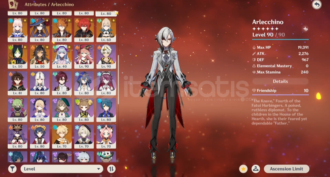 Haritaların hepsi fullenmiş durumda.Artifact açısından çok zengin bir hesap.Rate Up var Pity yaklaşık 10 civarı,hesap tamamen bana aittir top4 Arlecchino ve top7 Furinası vardır.Hesaptaki 4 yıldızlı karakterlerin nerdeyse hepsi c6dır.Çoğu 4 yıldızlı karakter skinleri de bulunmakta.Cons:Arle c2Raiden c1Kokomi c1Hu tao c1Keqing c4Mona c1Qiqi c2Diluc c1Jean c1Dehya c1Başka sorunuz olursa s...