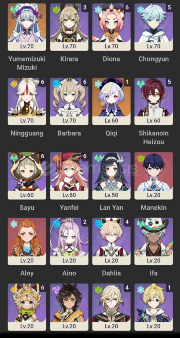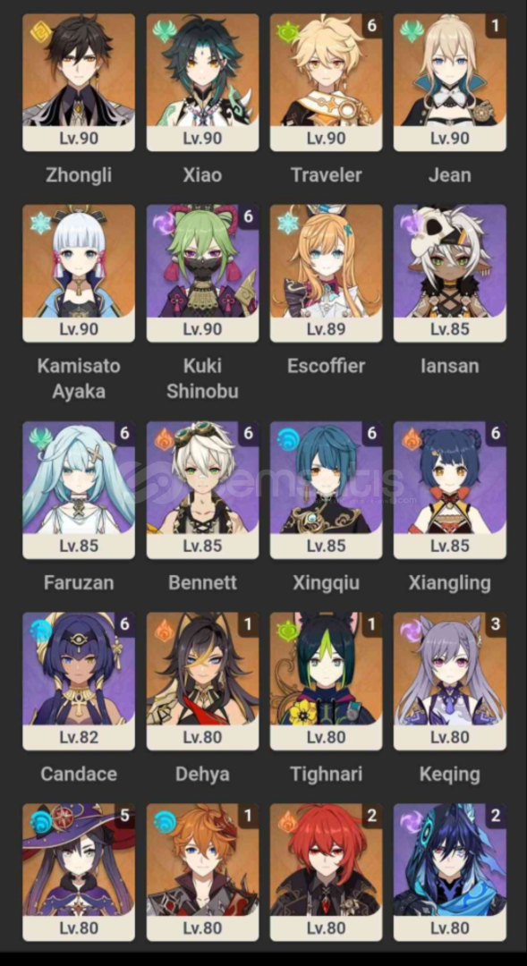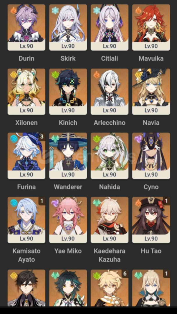 skirk, furina c3, escoffier, xilonen, navia, zhongli, wanderer + silahı, mona c5, kazuha + silahı, xiao + silahı, jean c1, ayaka + silahı, yae miko, kinich, nahida, ayato c1, cyno, citlali + silahı, durin + silahı, mavuika + silahı, arlecchino + silahı, hu tao c1, tighnari c1, childe c1, diluc c2 + silahı, dehya c1, qiqi c1, keqing c3, mizuki