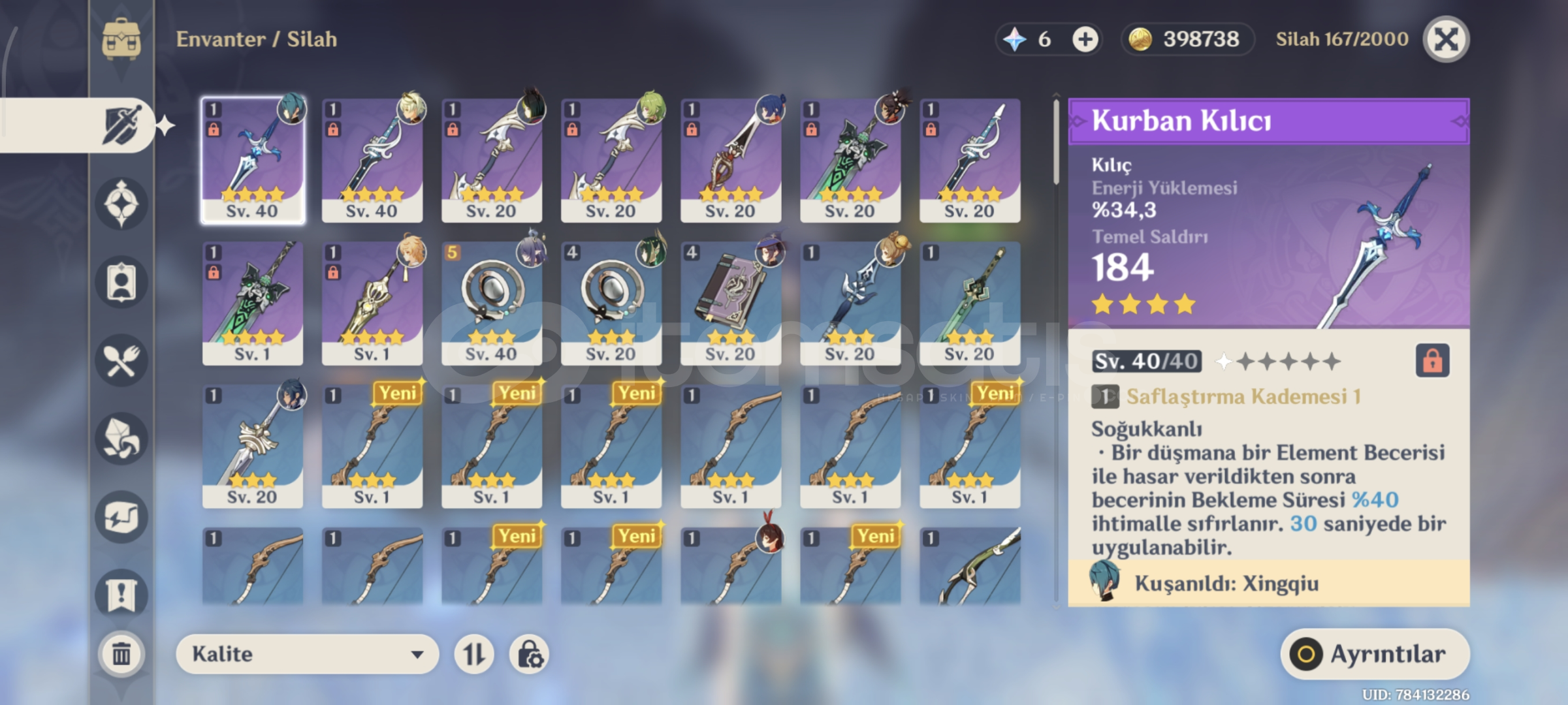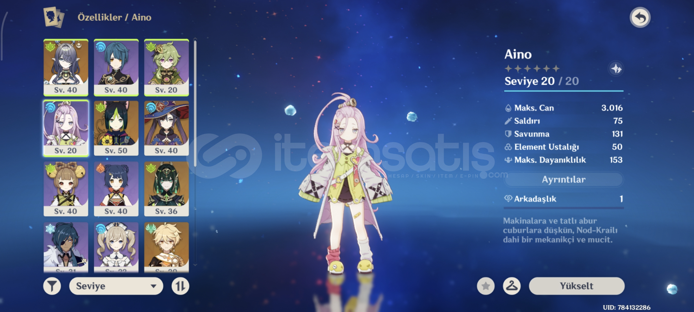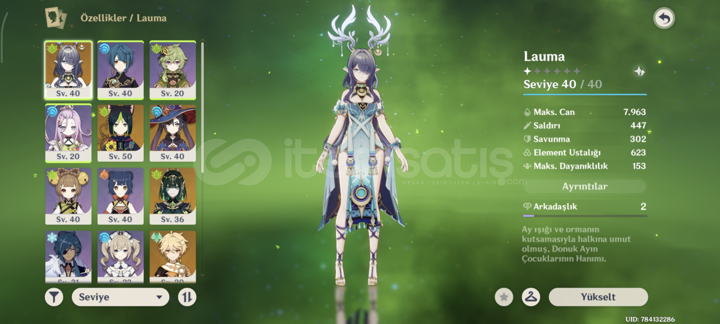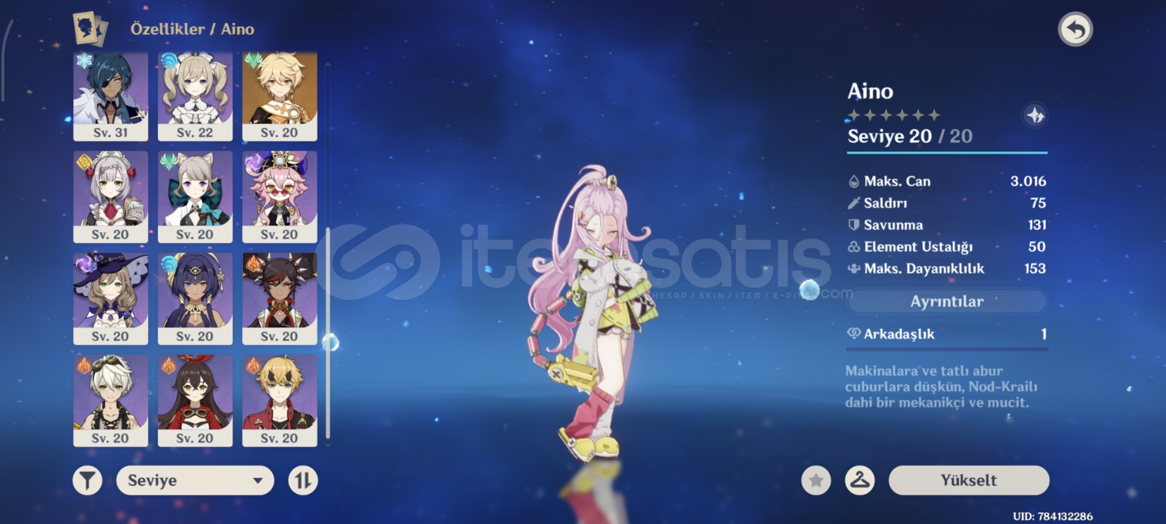 Hesapta Lauma Nefer Tighnari Mona Aino ve resimdeki 4*lar var.Resimdeki bölgeler hariç hiçbir bölge açılmamış, keşif yüzdeleri resimde mevcut.ŞANSLI HESAP10dan az pityde Lauma ve Mona çıktı.Hesap mail ile birlikte verilecektir. İsteyen değişim de yaptırabilir.Sorunuz olursa yazabilirsiniz.