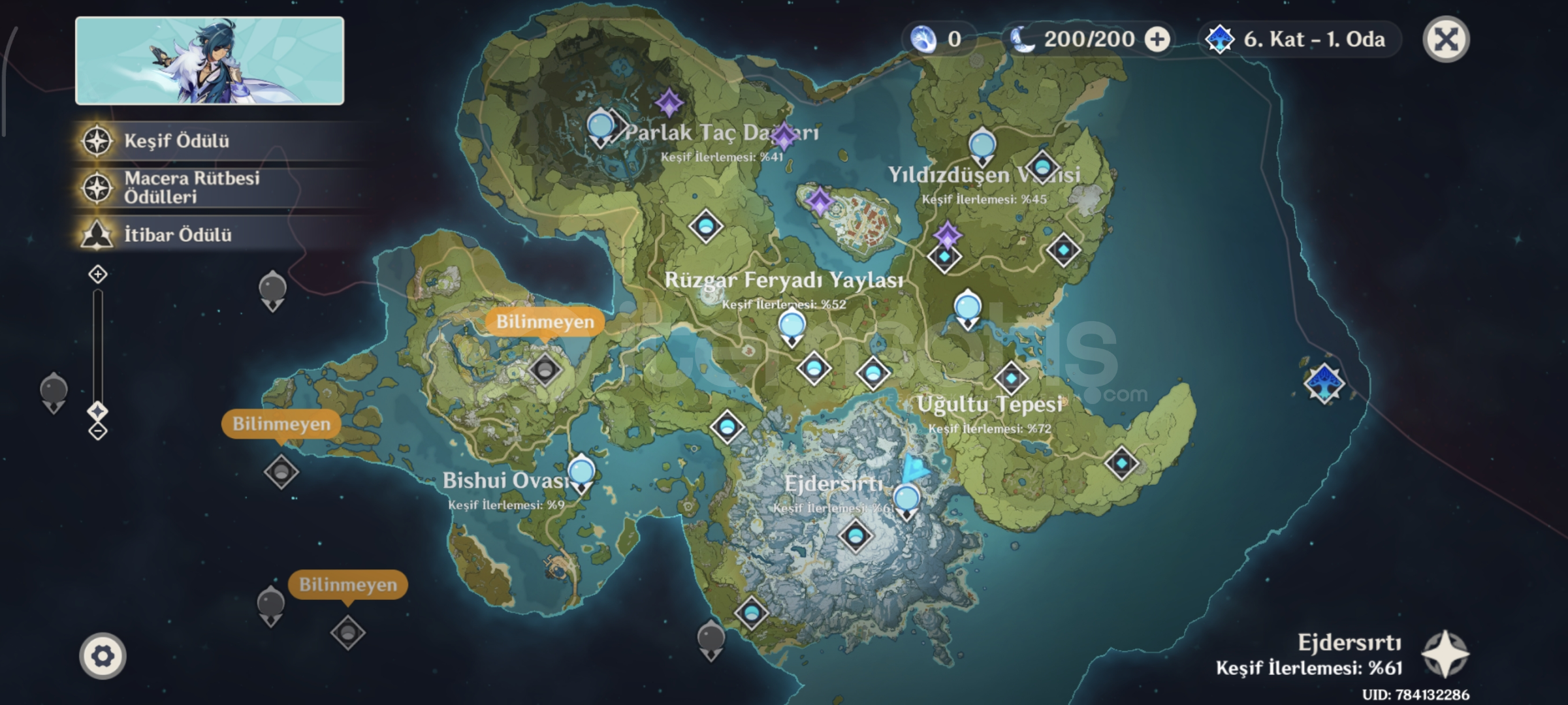 Resimdeki bölgeler hariç hiçbir bölge açılmamış, keşif yüzdeleri resimde mevcut.