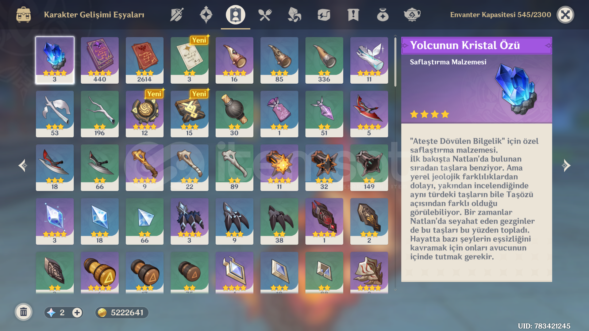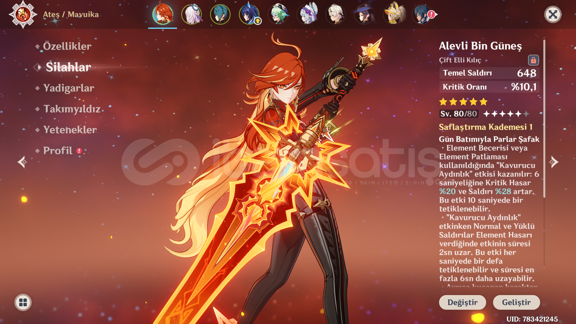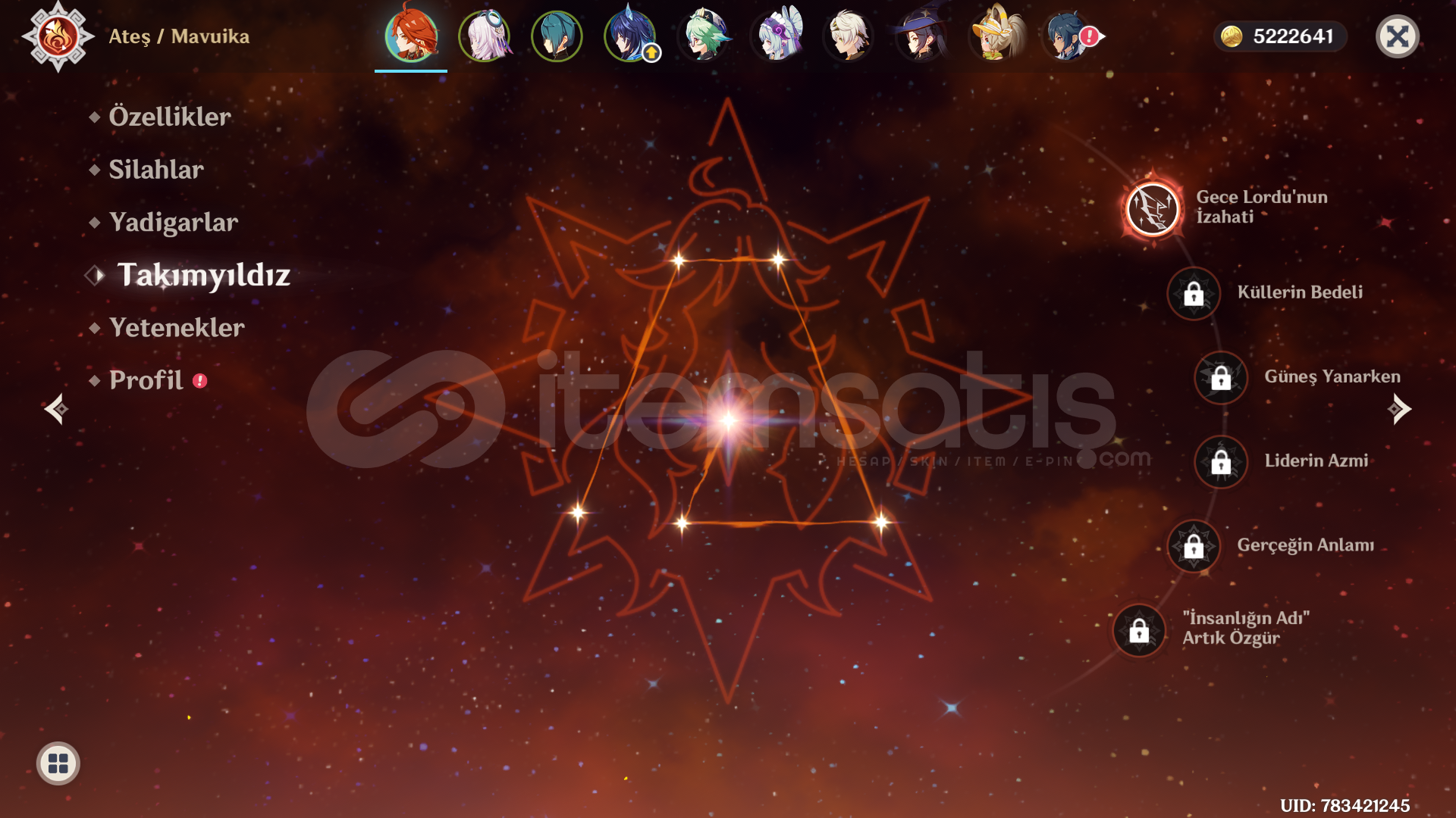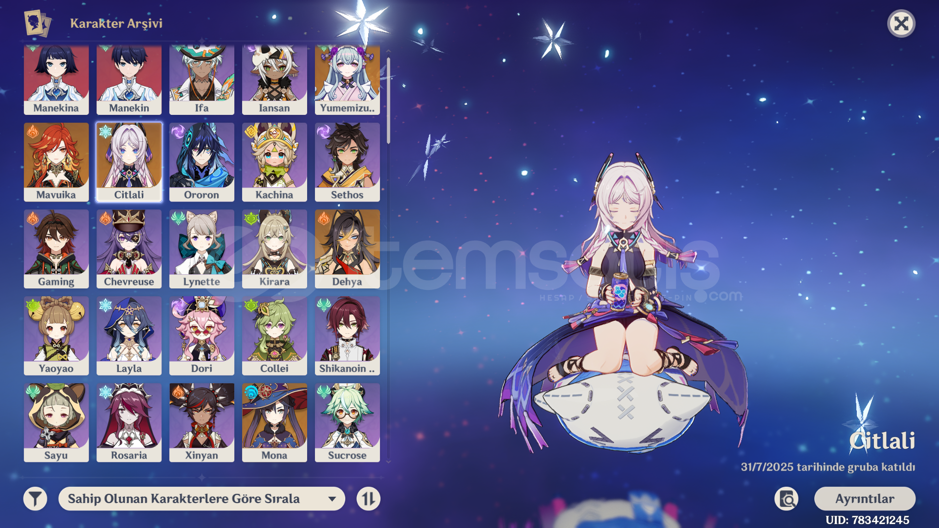 Hesabın AR si 55 tirHesapta 5 tane 5 yıldız ve 90 lvl xinqiu vardır.Hesapta Mavuika bulunmaktadır ve takımyıldız 1 dir.Ayrıca Mavuika nın kendi silahıda vardır.Hesapla ilgili ayrıntı görsellerde vardır.Hesabın etkinlik banner pity 27 dir.Ayrıcada Bannerda Rate - up vardır.