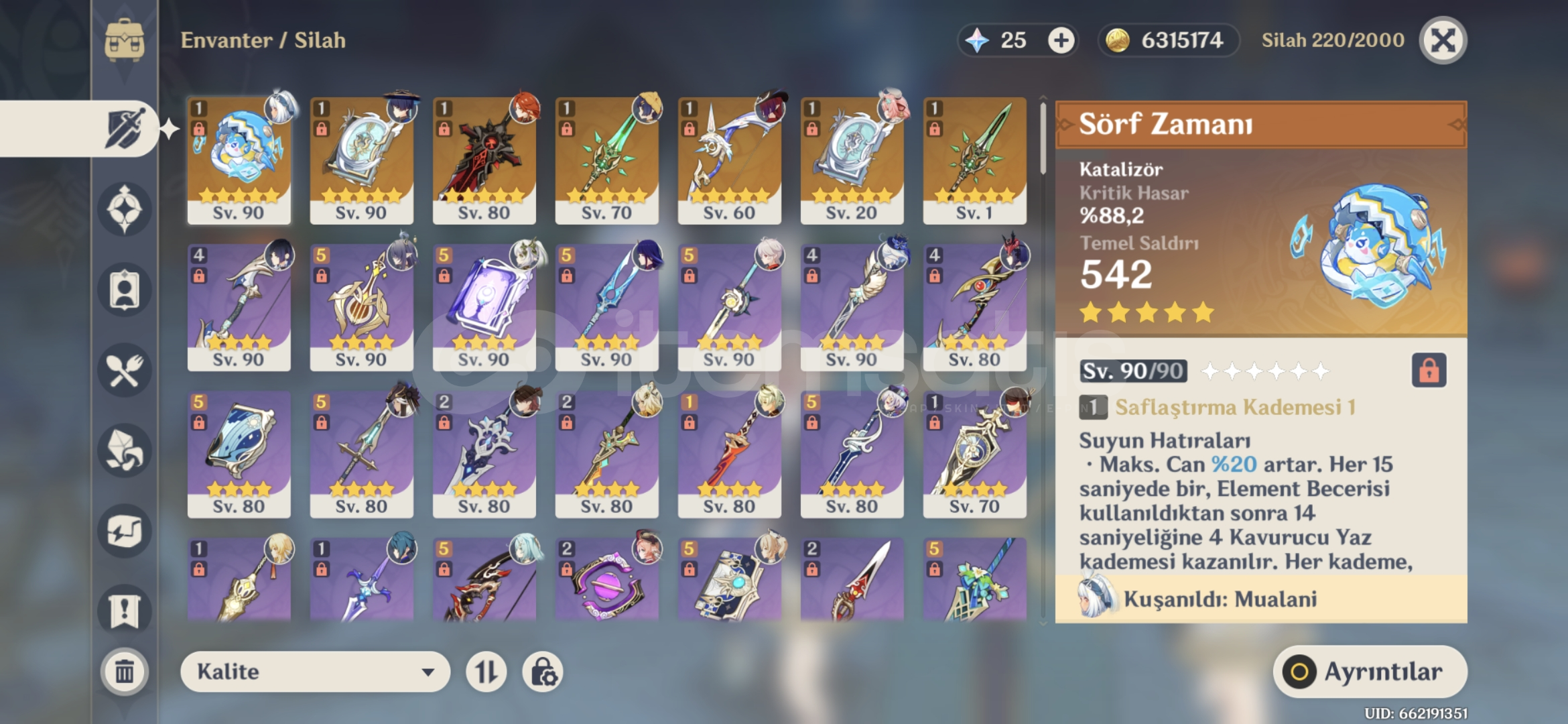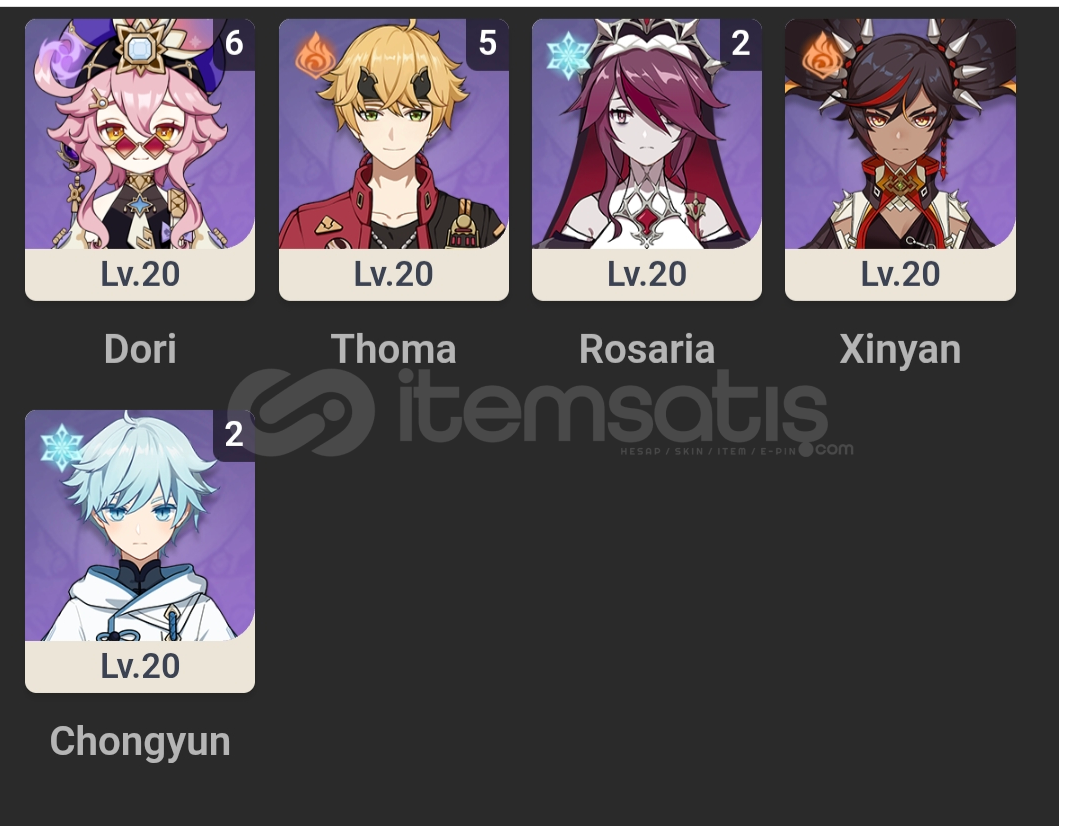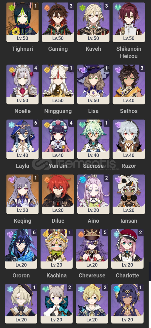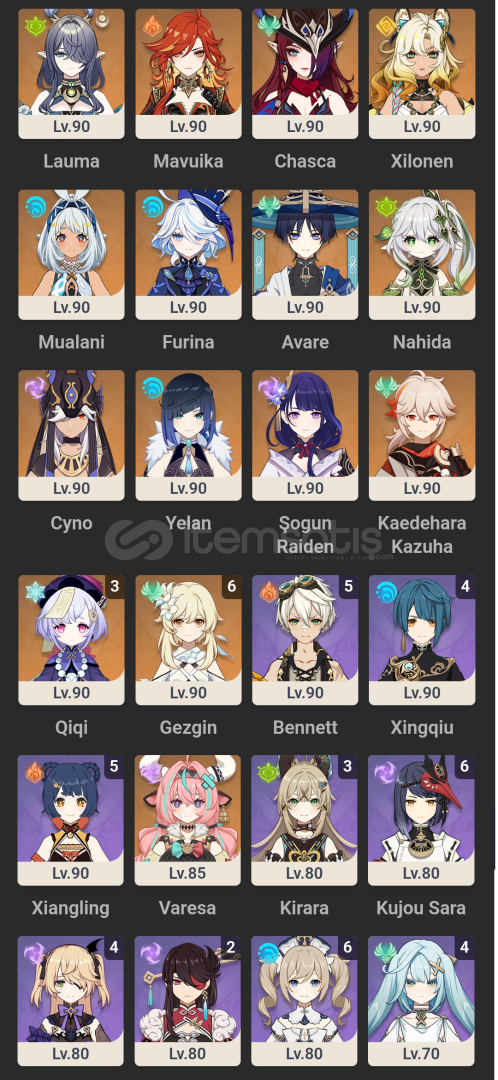 • Hepsi 90sv olan Mavuika,Mualani,Xilonen,Chasca,Lauma,Furina,Avare,Nahida,Cyno,Yelan,Raiden,Kazuha ve birçok 4 yıldızlı karakter bulunuyot