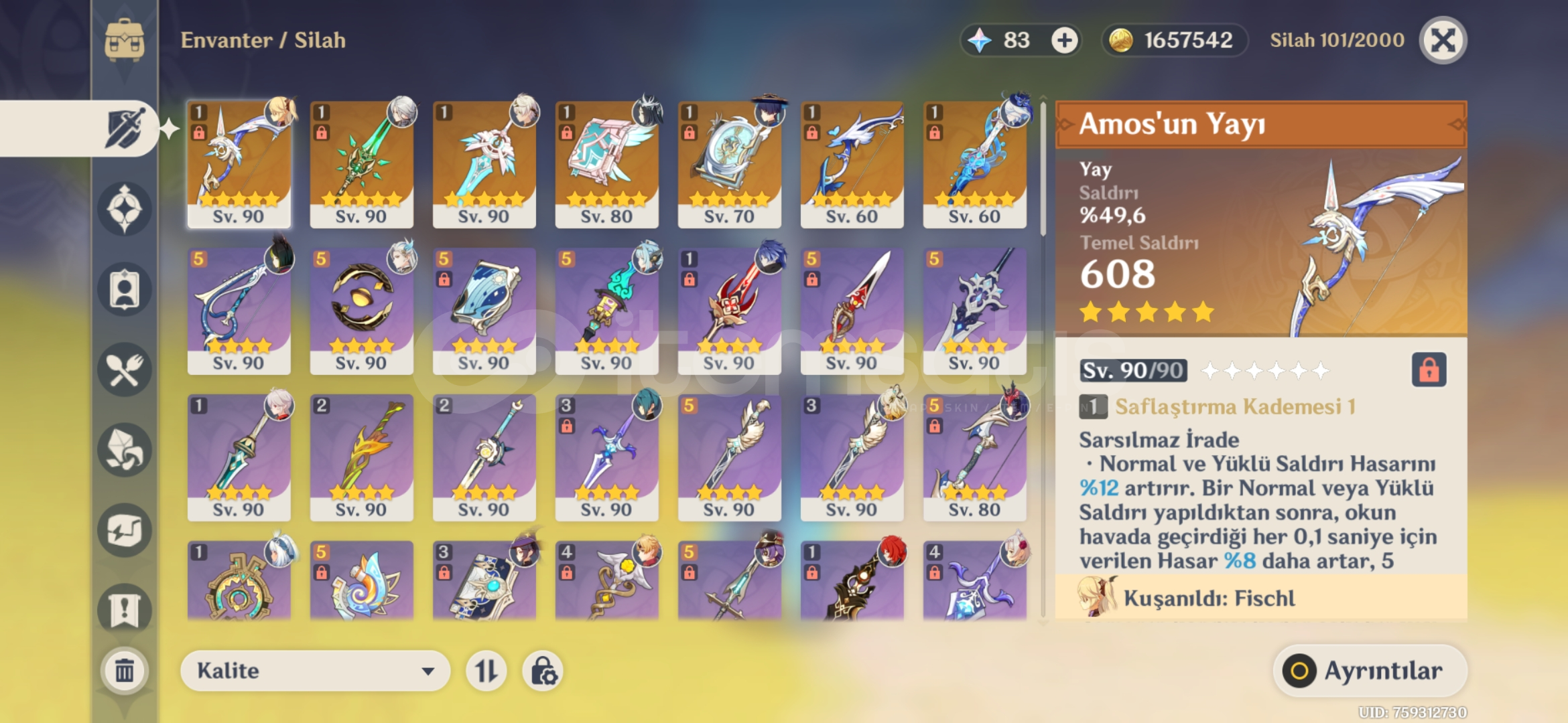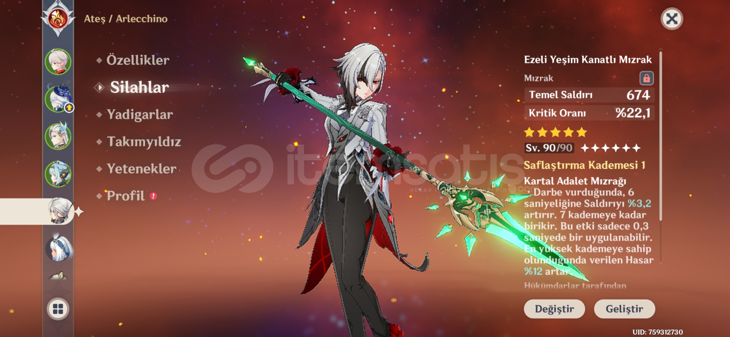 Eu 24(+10 cons)x5yıldızlı (gezgin dahil değil) 1101 başarım dünya ful c0r0 mavuika (bp silahı takılı)c0r0 flins(bp silahı takılı)c0r0 xilonen c0r0 kazuha (xiphos var) c1 r0 avare c0r0 arle c0r0 mualani c0 r0 inefa standartlardan mizuki eksik diğerleri var c1 mona c1 tignari c1 dehya c1 qiqi c2 diluc mevcut yelan bis de mevcut 2 kez bp açılmıştır(1 tanesi +10 seviyeli olandan) 2 seneye yakın welkin alındı pazarlık yapılır (not:hafta içi işte olduğumdan akşamları teslimat yapabilirim hafta sonu herhangi bir vakitte yapabilirim)