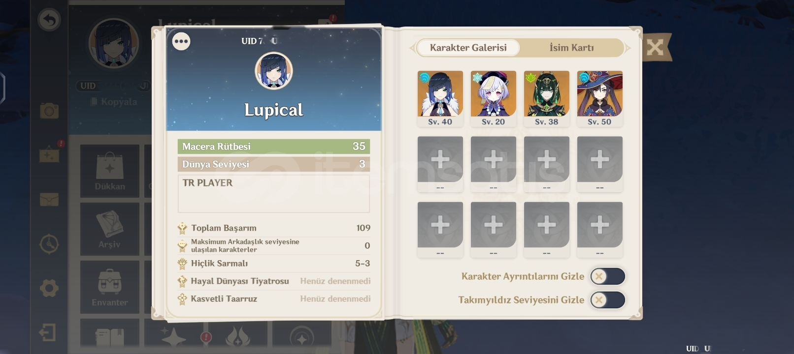 Ar35 Genshin hesabıdır.Avrupa serveri.4adet 5yildizli karakter ve 1 adet 5yildizli silah mevcuttur.Hesabın kapatılma gibi bir riski yoktur.