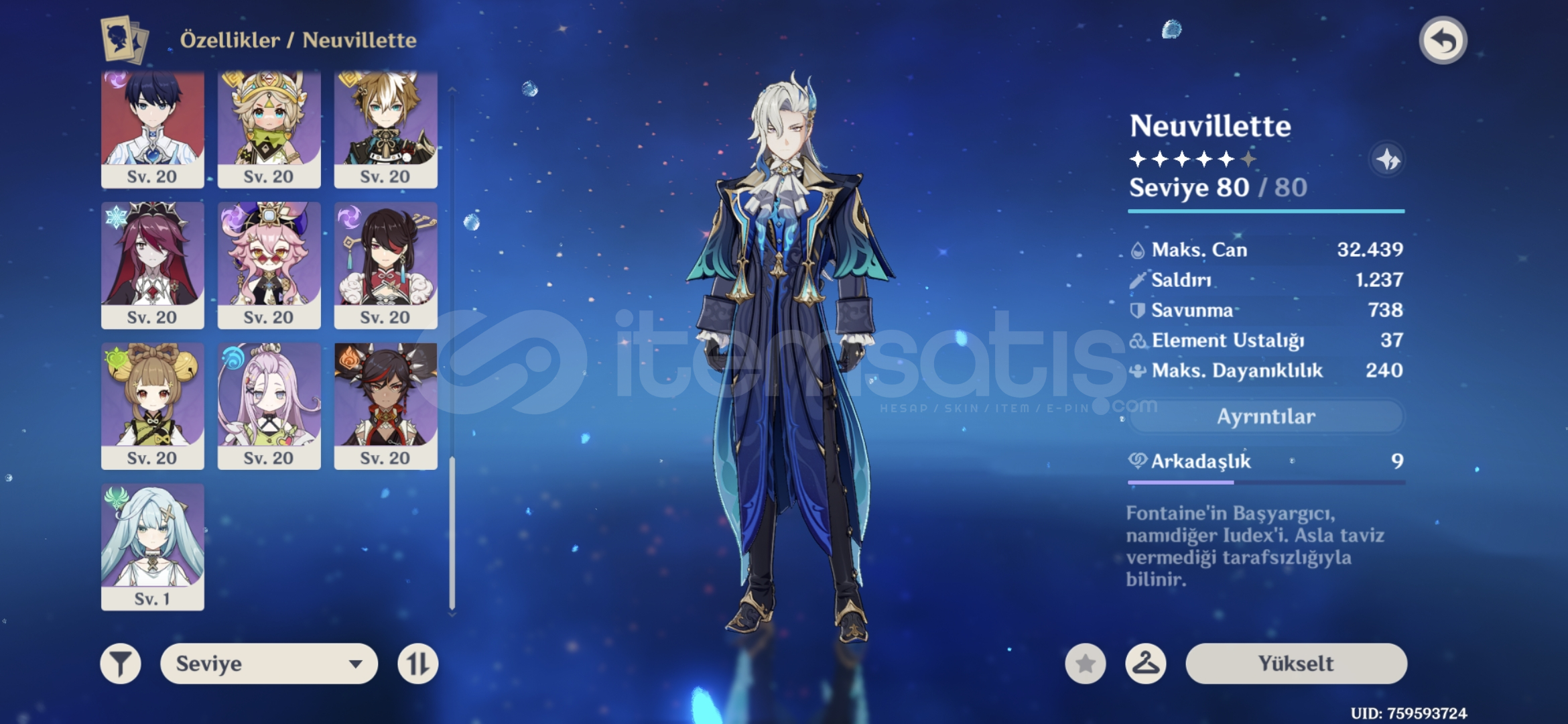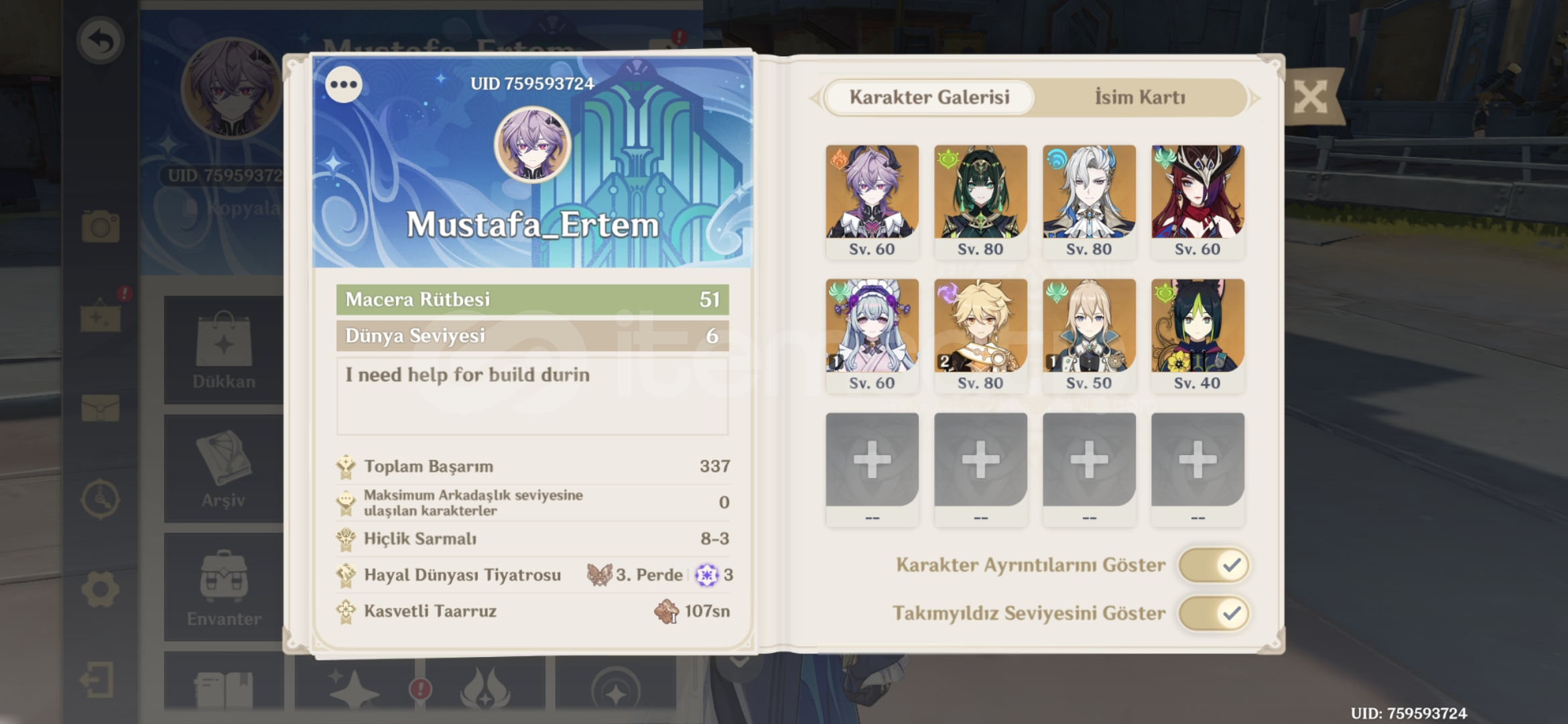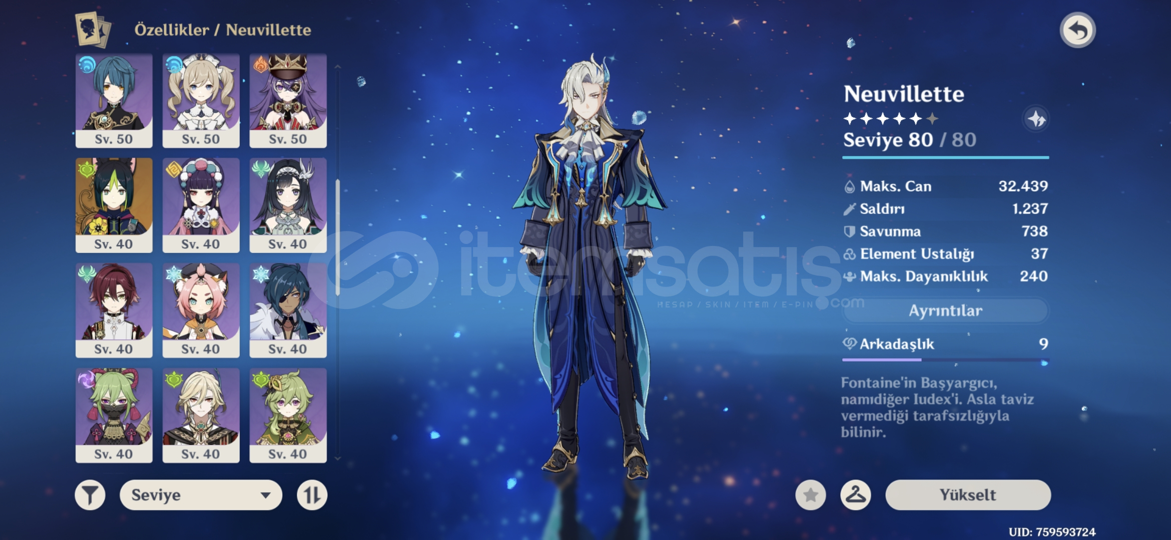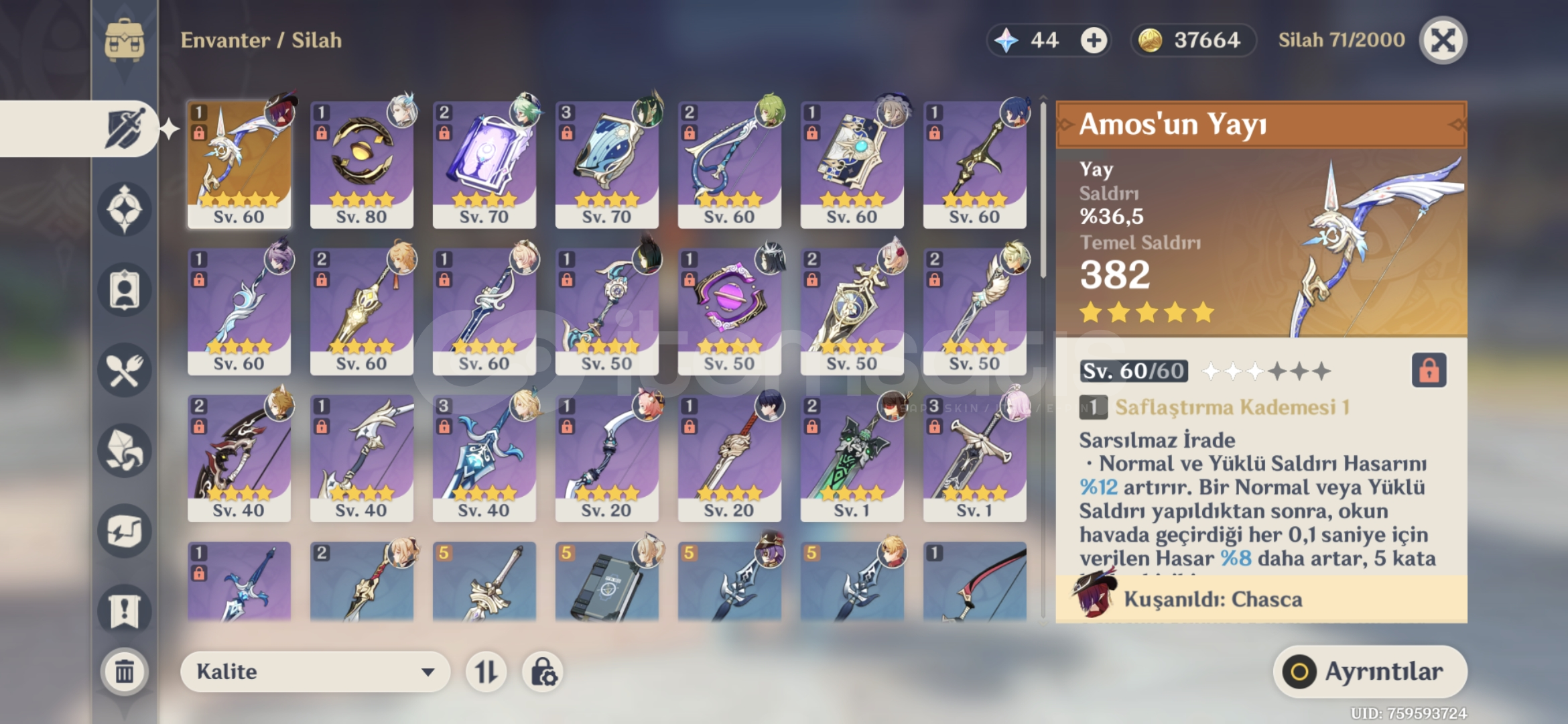 Öncelikle iyi günler dilerim.Hesap benim kendi main hesabımdır o yüzden herhangi bir sorun olmaz yani başka bir satıcıdan alınma bir hesap değildir o yüzden içiniz rahat olsun.Hesapta içerik olarak genel hatlarıyla buildleri az buçuk olan durin+nefer+chasca+neuvilette vardır bunların dışında r1 amosun yayı vardır 5 yıldızlı olarak.4 yıldızlı olarak ise...