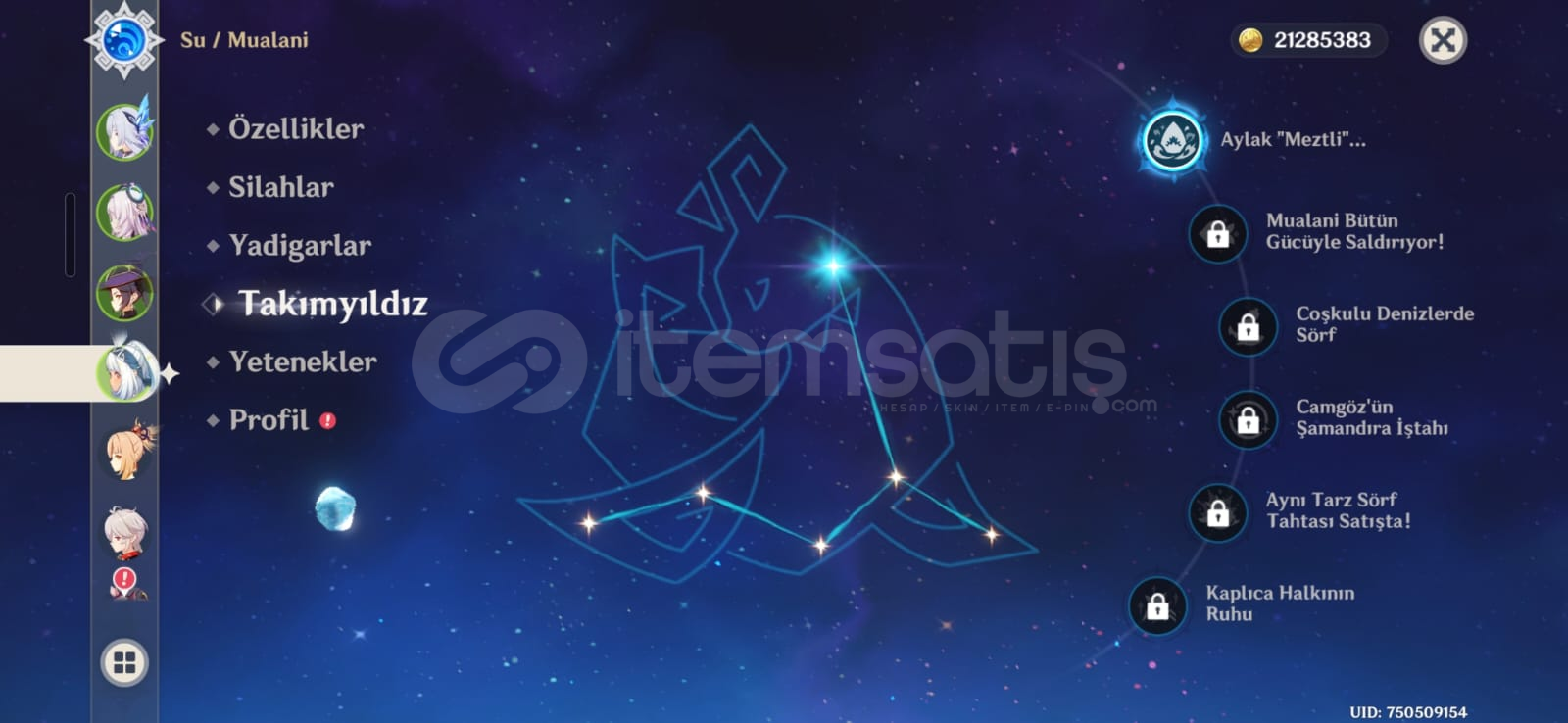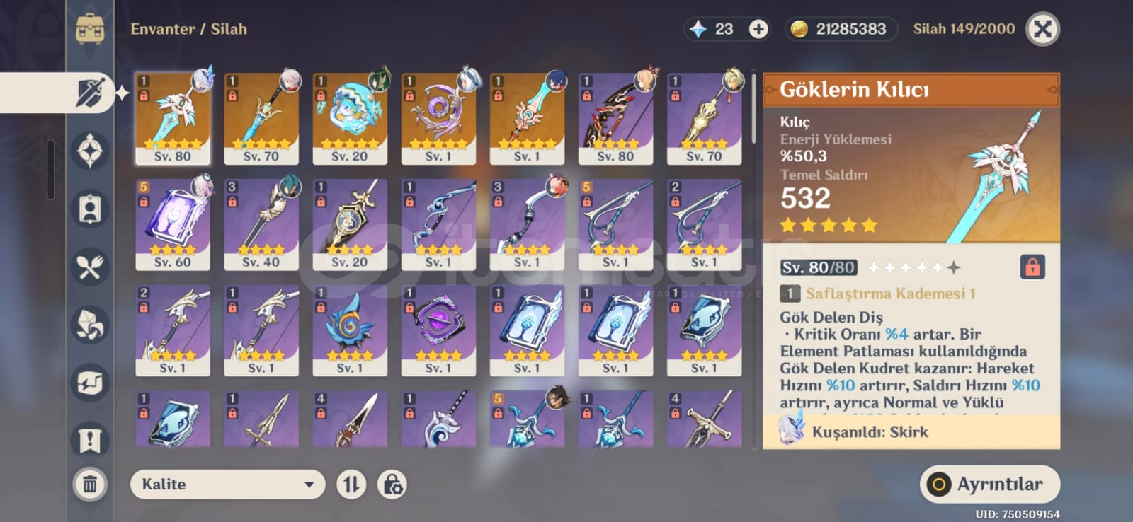 NeferSkirkKazuha + bisCitlaliMualani C1 + bisYoimiya(Kokominin silahi da var)Dehya qiqi mona vb.Hesapta 21 milyon mora + 1100 küsur xp kartı vardir istediğiniz karakteri kasabilirsinizMail değişimi yapilacaktir