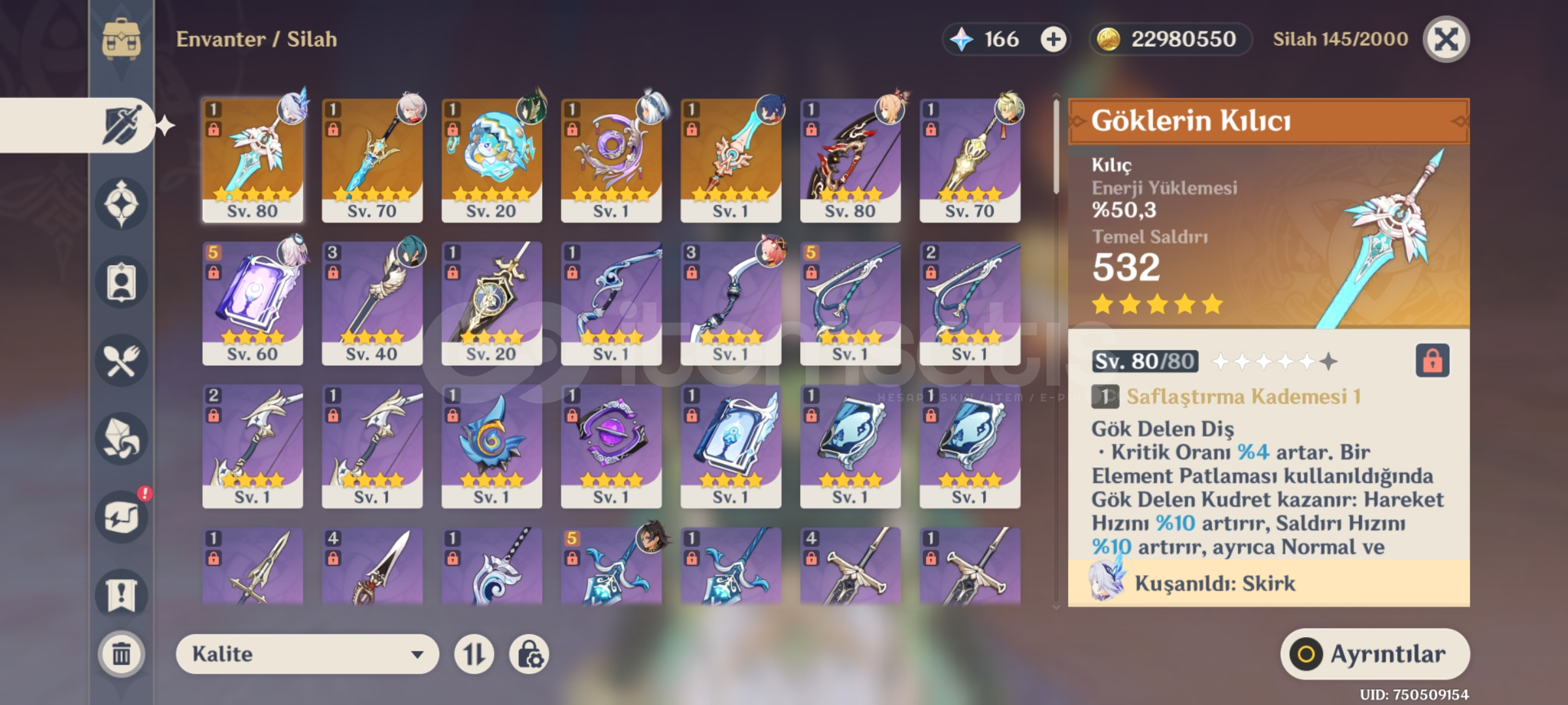 NeferSkirkKazuha + bisCitlaliMualani C1 + bisYoimiya(Kokominin silahi da var)Dehya qiqi mona vb.Hesapta 23 milyon mora + 1200 küsur xp kartı vardir istediğiniz karakteri kasabilirsinizMail değişimi yapilacaktirSorunuz olursa sorabilirsiniz pazarlik yapilabilir.