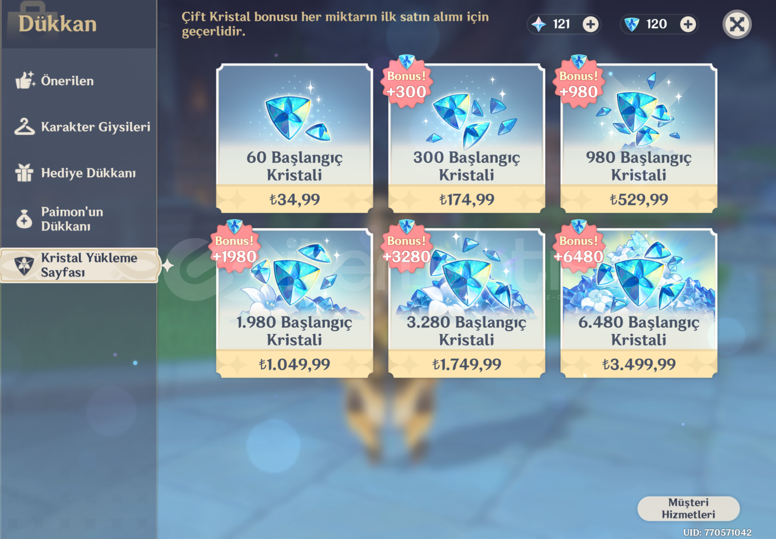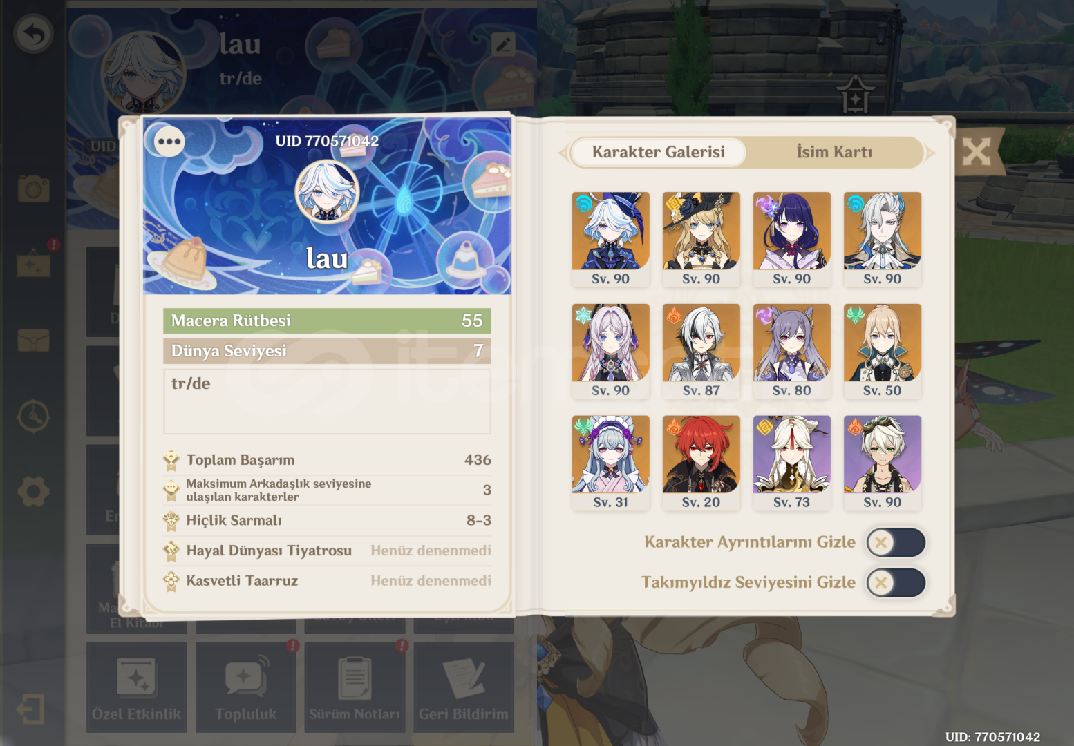 Satılık Genshin Impact hesabım. Oyuna vakit ayıramadığım için satıyorum.🔹 Macera Rütbesi: 55🔹 Dünya Seviyesi: 7🔹 Sunucu: EU🔹 Toplam Başarı: 436🔹 Spiral Abyss: 8-3🔹 45 pity’de kazanma garantili (bir sonraki 5★ kesin seçtiğiniz karakter!)💫 Bazı karakterler:Furina , Raiden Shogun, Navia, Arlecchino, Citlali, Neuvilette, Yumemizuki MizukiBirço...