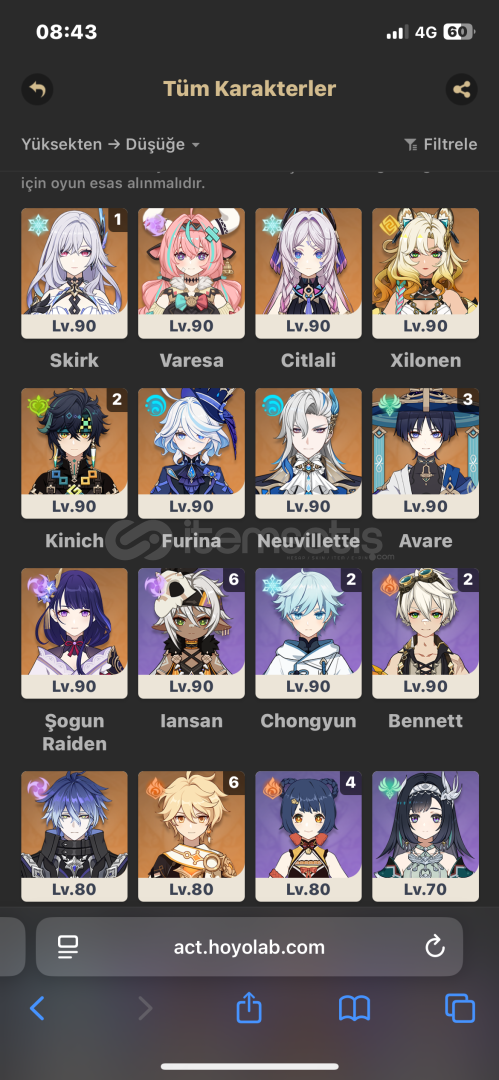 5 yıldızlı karakterler (Cons levelleri) ve silahlar (Refine aşamaları) şu şekildedir;Skirk (C1)VaresaAvare (C3) - BIS Silahı (R1)Kinich (C2) - Serpent Spine (Sadece battle pass ile alınır ve R5)Neuvilette - Jadefall's Splendor x2 (R1)Raiden Shogun - Skyward Spine x2 (R1)XilonenCitlaliFurinaDehya (C4)QiqiMizukiKeqingDilucTighnari (C1)Flins+ Göklerin Liri çıktıHiçbir bölgede explore Enkonomiya (%78) dı...