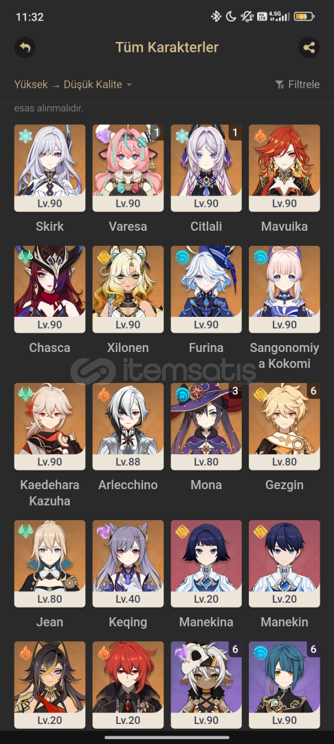 Skirk R1Citlali C1Veresa C1MavyakaKazuhaArlechinoChascaFurinaKokomiMona C3XilonenJeanDilucDehyaKeqingİansan C6Xinqcu C6Xianglin C6Gaming C6Bennet C2Dahada 4 yılızlı karakterlerPazarlık olurHesap haritalarda hala bisürü primo kasma yeri var kacmaz sanslı hesap😀