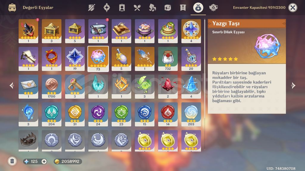 Karakterler 5:Flins Ineffa Mavuika İmza Silah Arlecchino İmza Silah Yelan Furina Navia Neuvillette Kazuha Zhongli İmza Silah Xianyun Citlali Ayato Xiao Yae Miko Baizhu Dehya Jean C2 Tighnari C1 Mona C1 Keqing C1 QiqiSilahlar:Göklerin Liri, Alevli Bin Güneş, Kurdun Mezar Taşı, Gönül Yayları, Göklerin Gururu, Kızıl Ayın Sureti, Girdap Söndüren73 WISH + 14 GUN WELKIN PITY 30