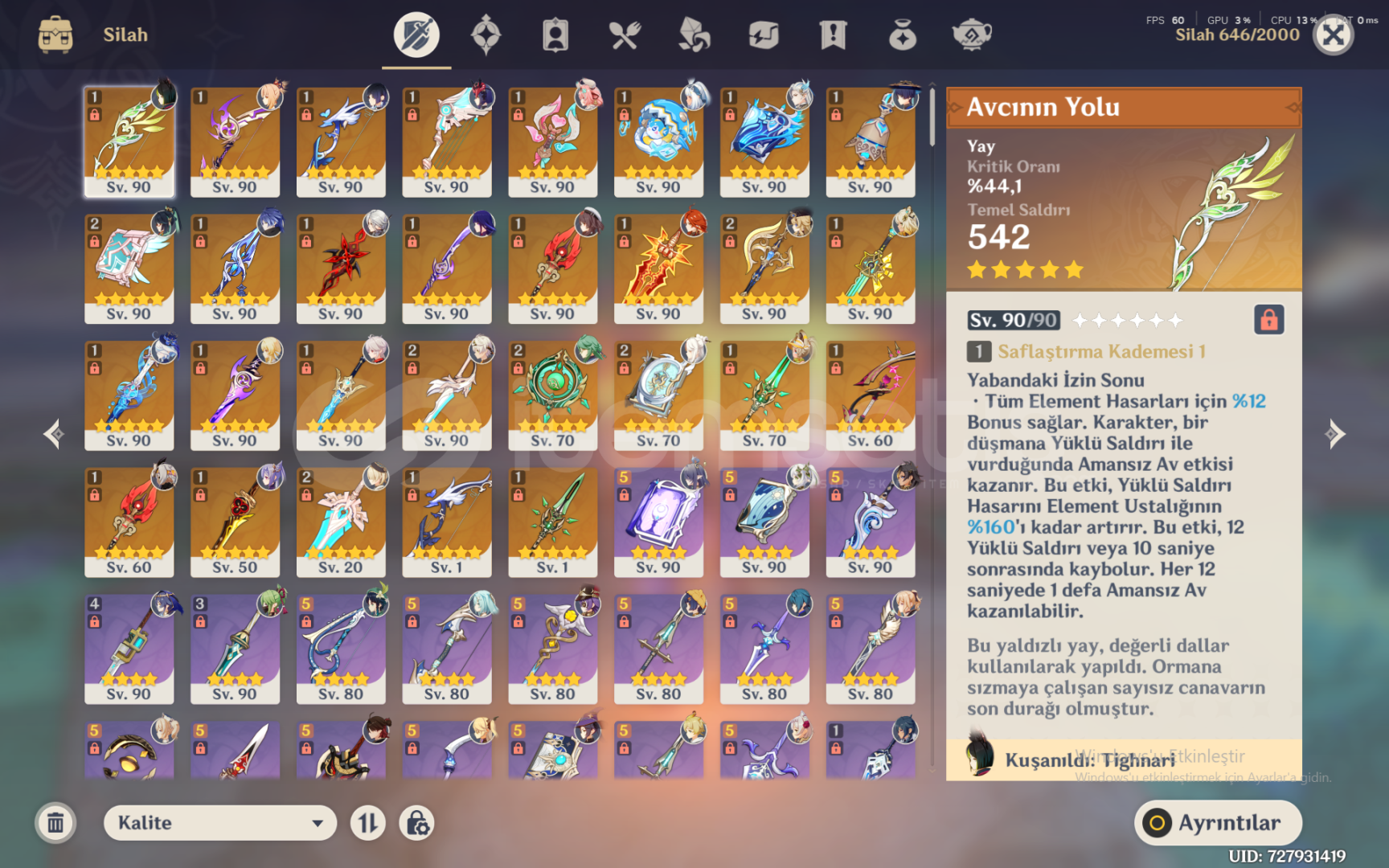 Hesaptac4 Neuvillette Bisc3 Raiden Bisc2 Furina BisC2 Kazuha Bisc2 Mulani Bisc1 Yelan Bisdiğer event karakterlerı c0 dır ve hepsinin kendi silahı mevcuttur.Natlanda acılan son yer ve Nod krai bölgesi kasılmamıştır.Abyss ve Tiyatro rahat dönmektedır.Event pity 70 en son Flins çıkmıstır.Sılah bannerında da flinsin silahı çıkmıştırC5 tignari c4 Jean Keqing Qiqi C3 Dehya C1 dil...