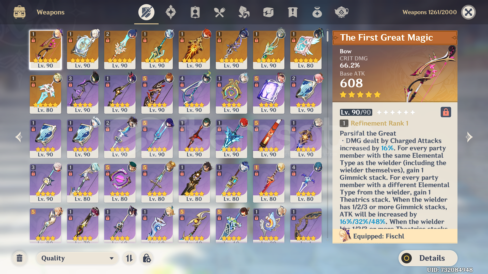 Silahlar arasında The First Great Magic, Lost Prayer, Light of Foliar Incision, Beacon of the Reed Sea, Absolution, Fang of the Mount King, Skyward serisi gibi güçlü 5★ silahlar yer almaktadır.