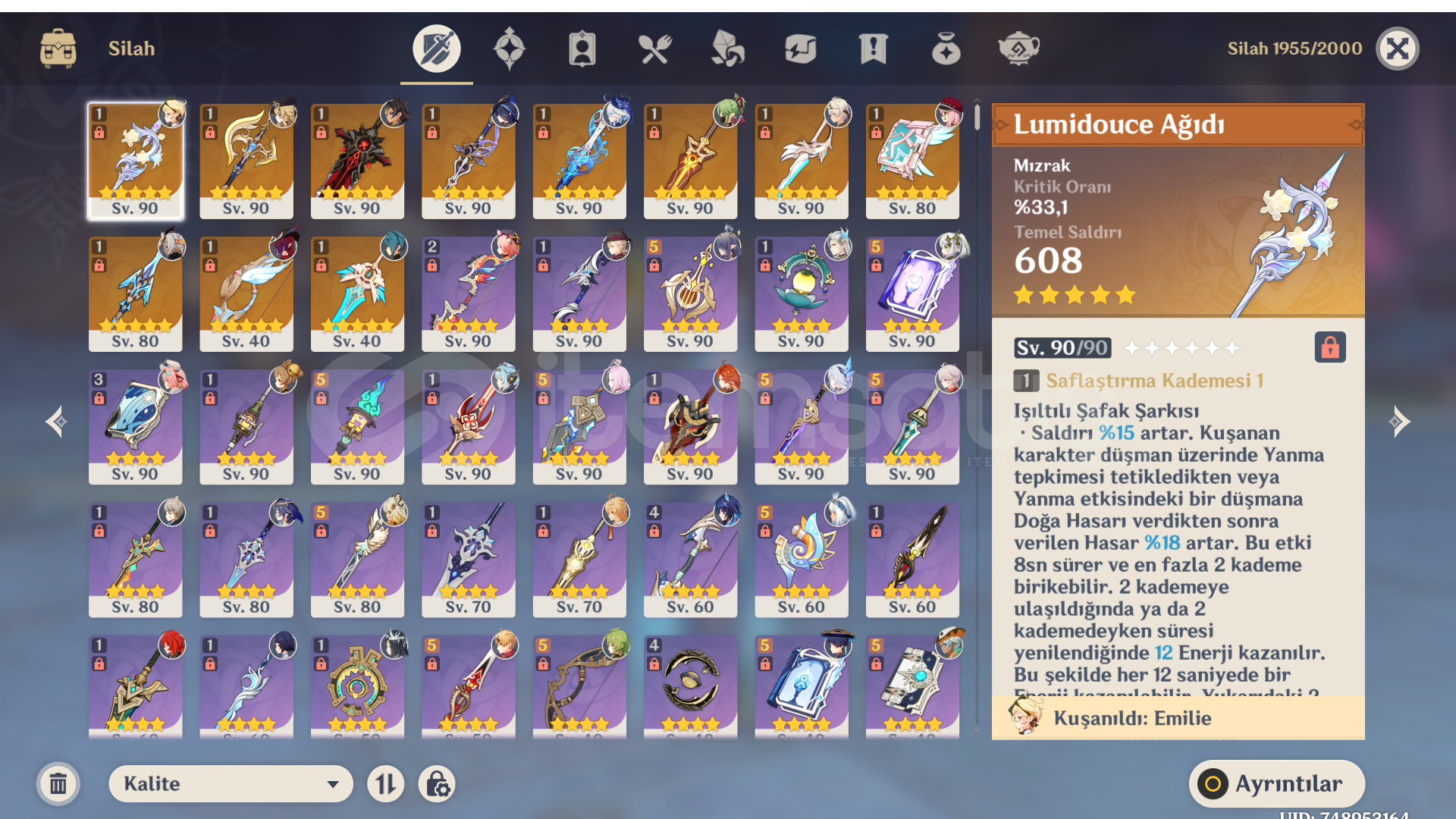 Hesabın 2. sahibiyim. 1.5 seneden fazla oldu aralıksız oynuyorum. Hesapta yaklaşık 1.5 aylık welkin var. Rateup yok. AR60.Tüm bölgeler %100. Eksik sandıklar illa olabilir. Bütün heykeller full. Bütün çeşme ve ağaç vs. Full.-5* Karakterler:Nefer - C0 R0 - YENİ*Neuvillette - C0 R0 -Furina - C1 R1 -Lauma - C0 R0 -Ineffa - C0 R0 -Xilonen - C0 R0 -Navia - C0 R1 -Chasca - C0 R0 -Kazuha - C0 R0 -Skirk - C0 R0 ...