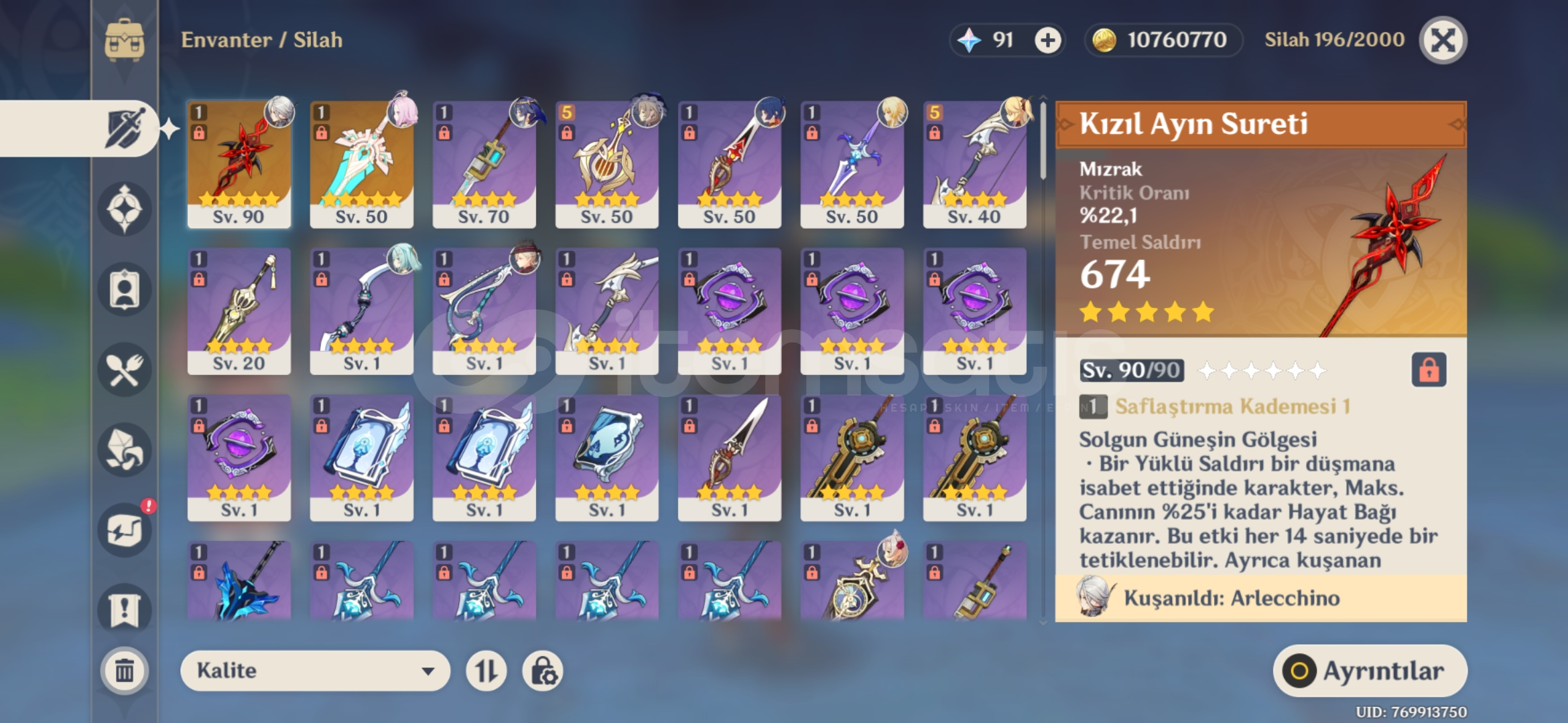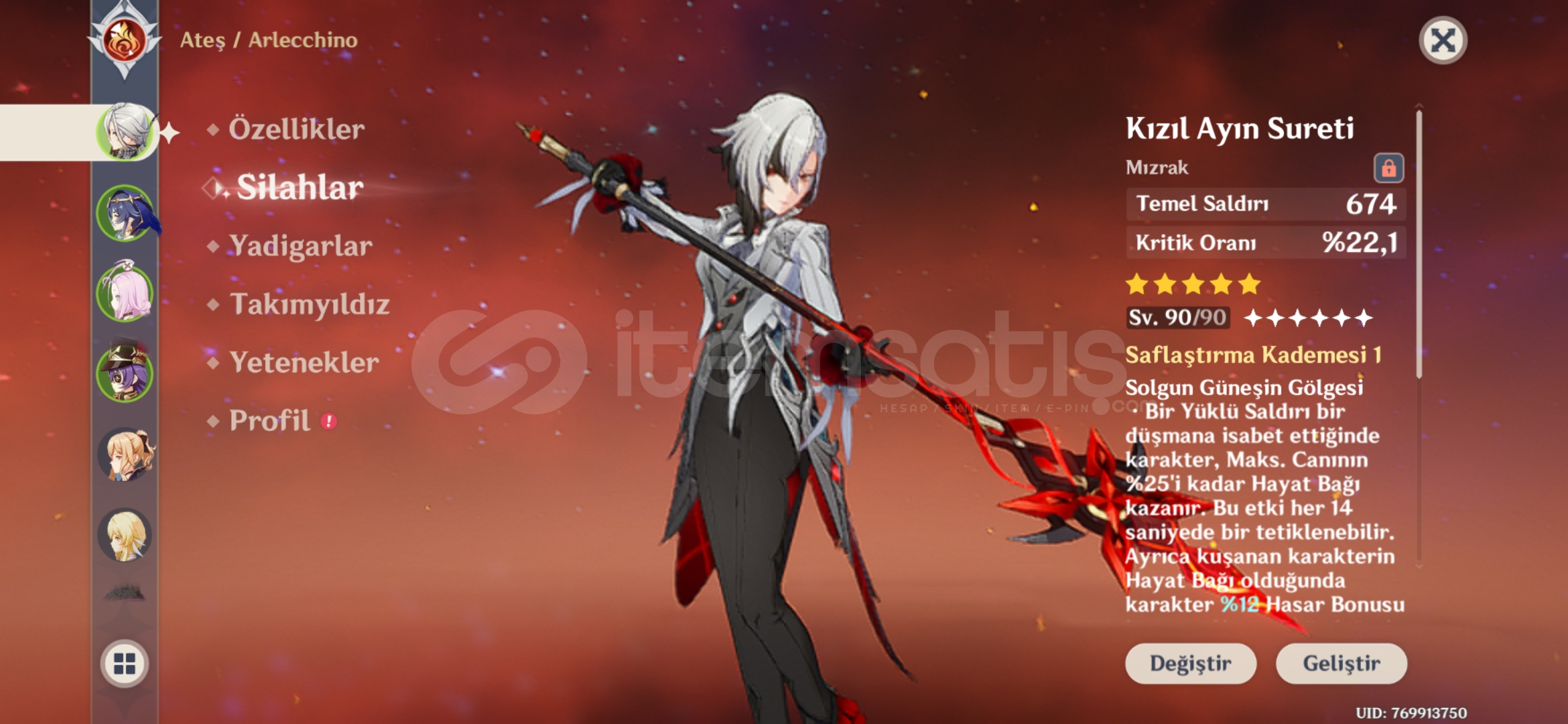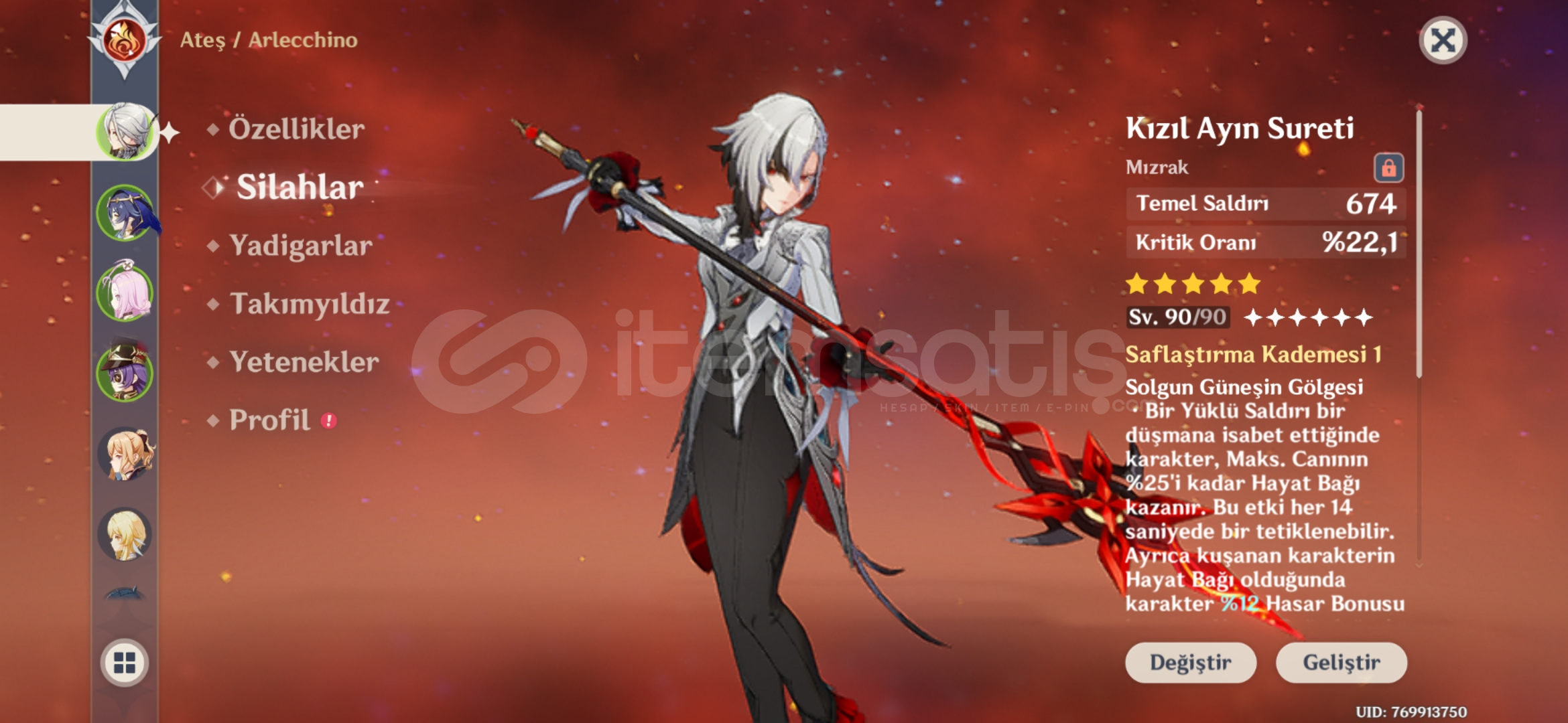 Arlecchino ve Silahi vardır.Hasar oranı çok çok iyi.2.900 saldırı gücü var.Pity 65Harita keşif oranları resimlerde mevcuttur.