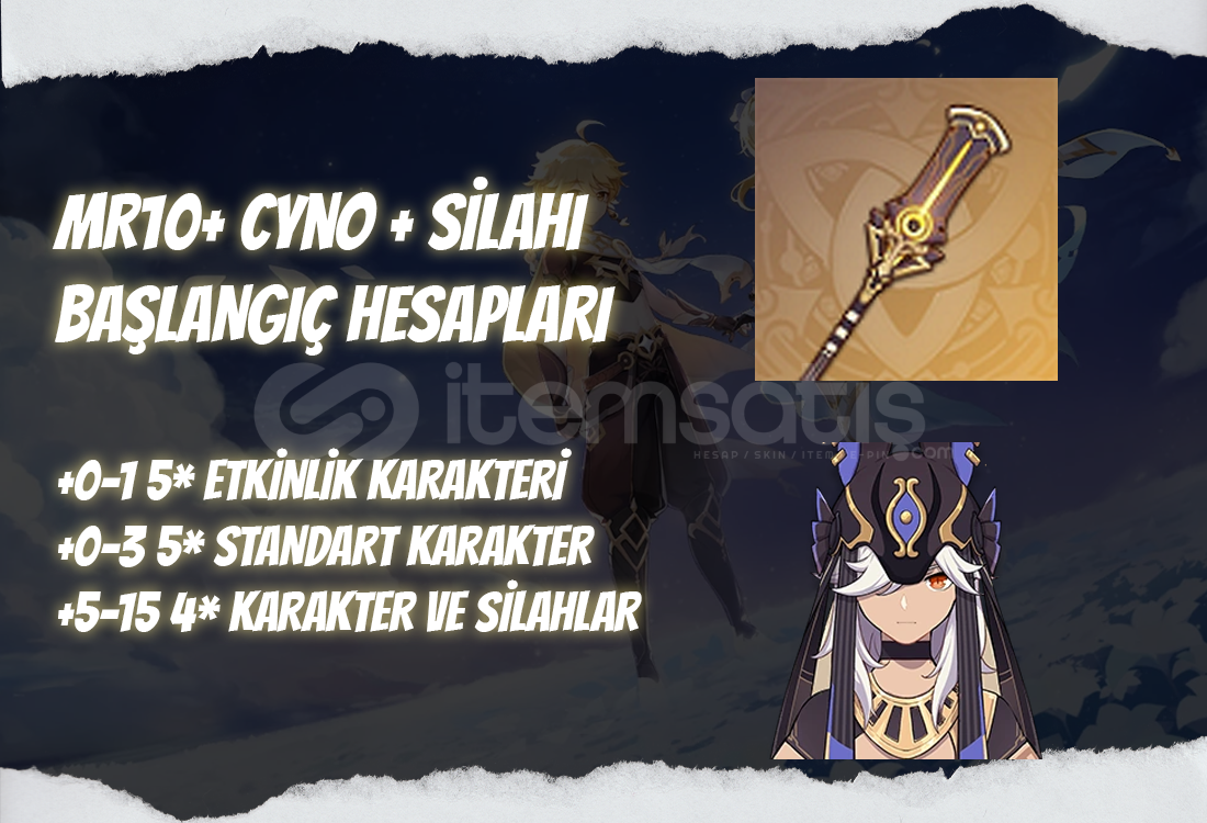 Bu ilanı satın aldığınızda MR10+ seviyesinde içerişinde Cyno + kendi silahı bulunan bir hesap tarafınıza iletilecektir.Hesapların içerişinde 0-3 adet 5* standart karakter içerebilir.Hesapların içerişinde bir miktar köken taşı bulunabilir.Tüm hesaplarımız garantilidir ve alım sonrası Kullanıcı adı ve &...