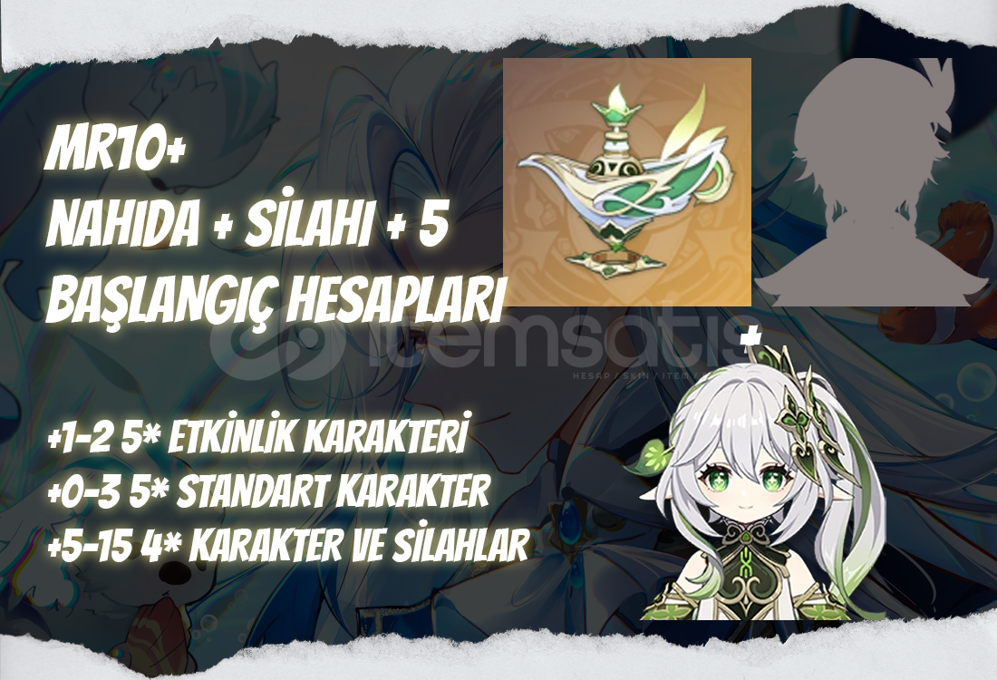 Bu ilanı satın aldığınızda MR10+ seviyesinde içerişinde Nahida + kendi silahı ve rastgele 5* etkinlik karakteri bulunan bir hesap tarafınıza iletilecektir.