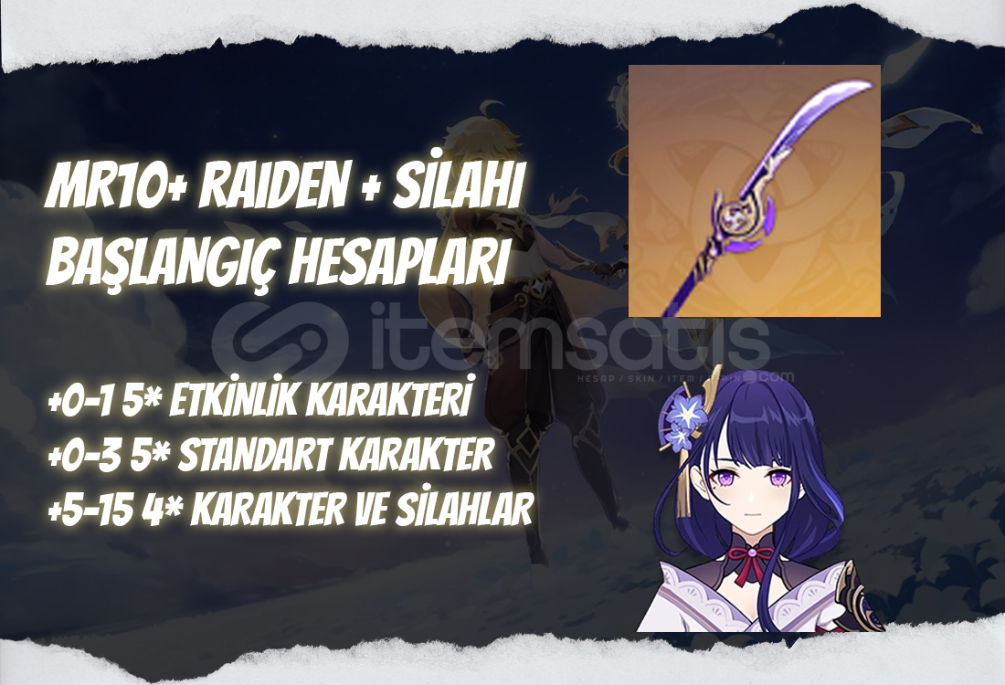 Bu ilanı satın aldığınızda MR10+ seviyesinde içerişinde Raiden Shogun + kendi silahı bulunan bir hesap tarafınıza iletilecektir.Hesapların içerişinde 0-3 adet 5* standart karakter içerebilir.Hesapların içerişinde bir miktar köken taşı bulunabilir.Tüm hesaplarımız garantilidir ve alım sonrası Kullanıcı ad&#...
