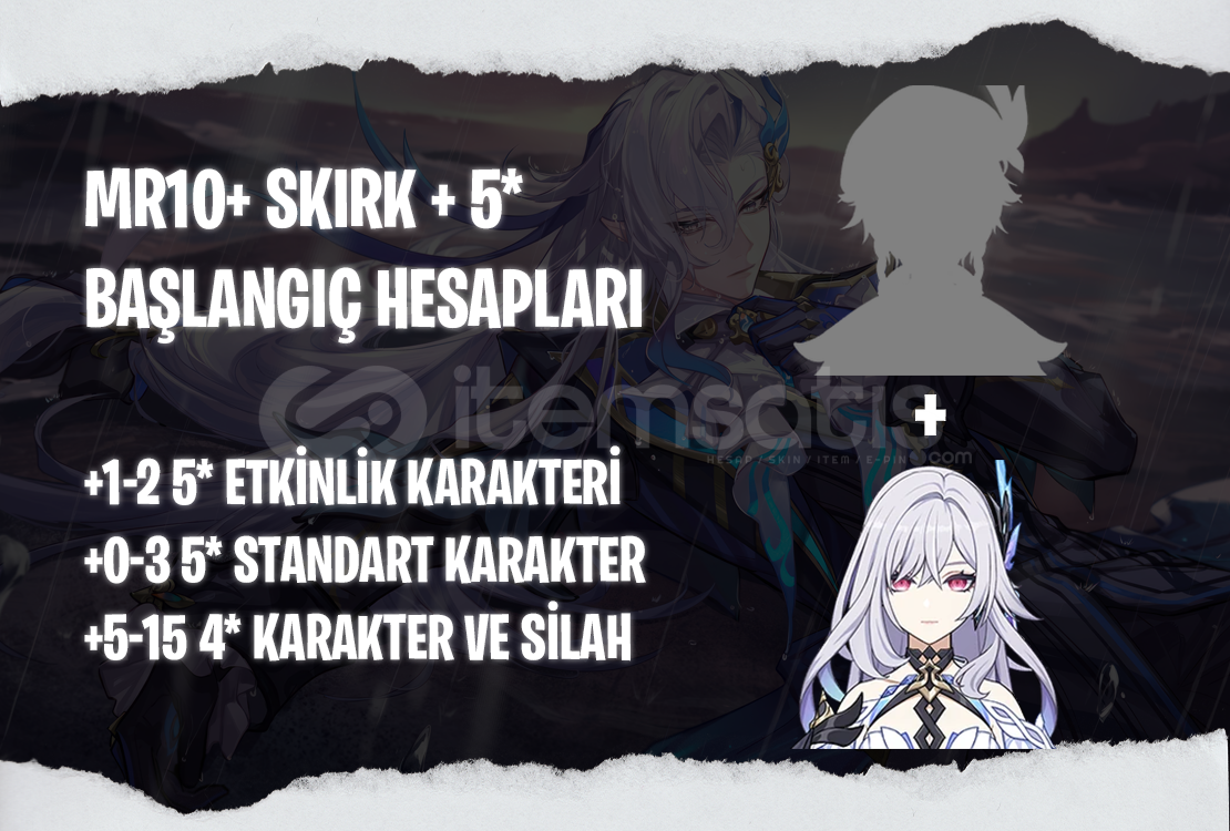 Bu ilanı satın aldığınızda MR10+ seviyesinde içerişinde Skirk + 1-2 adet rastgele 5* etkinlik karakteri bulunan bir hesap tarafınıza iletilecektir.
