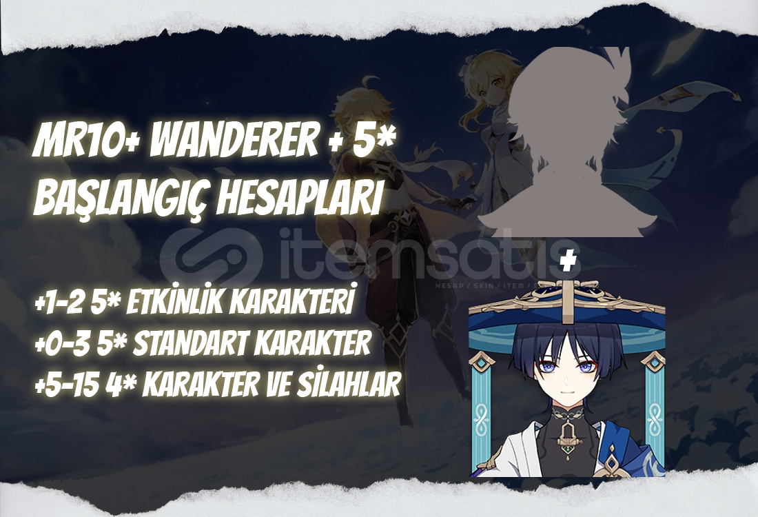 Bu ilanı satın aldığınızda MR10+ seviyesinde içerişinde Wanderer + 1-2 adet rastgele 5* etkinlik karakteri bulunan bir hesap tarafınıza iletilecektir.Hesapların içerişinde 0-3 adet 5* standart karakter içerebilir.Hesapların içerişinde bir miktar köken taşı bulunabilir.Tüm hesaplarımız garantilidir ve alım sonrası Kullan&...