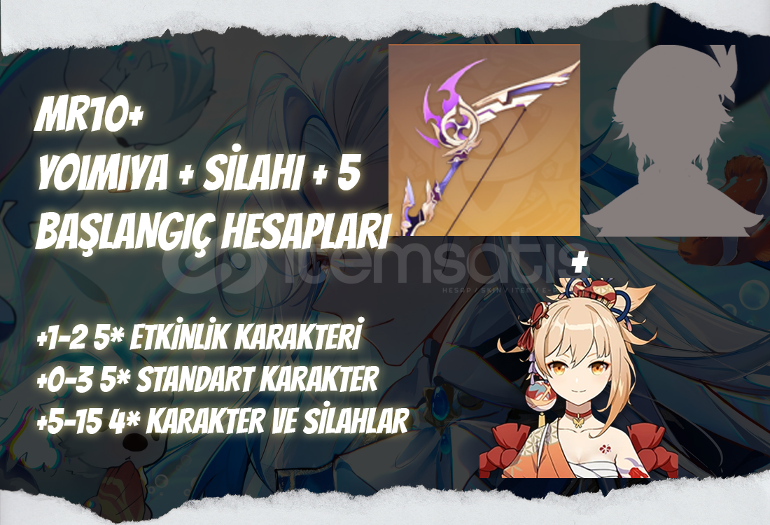 Bu ilanı satın aldığınızda MR10+ seviyesinde içerişinde Yoimiya + kendi silahı ve rastgele 5* etkinlik karakteri bulunan bir hesap tarafınıza iletilecektir.